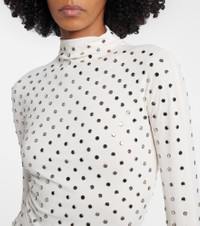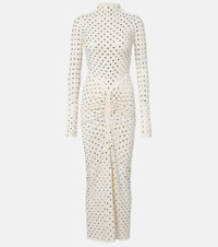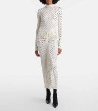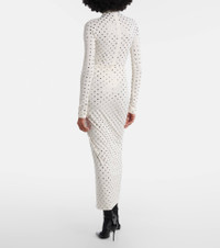 Upholding the legacy of Azzedine Alaia, the maison’s collections achieve an artful balance between sculptural and wearable. This jersey maxi dress is adorned with shimmering embellishments and features a gathered waist with a subtle slit. Product Details - Material: 100% viscose - Care instructions: specialist clean - Made in Italy - Color: white - Designer color name: Pannacotta/Crystal - Closure: concealed zipped back - Collar: mockneck - Item number: P01118709 Size & Fit - True to size - Close fit at the neck - Fitted - Slightly stretchy fabric - High-cut leg - Height of model is 177cm-69.5" and wears a size FR 34