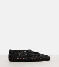 Inspired by classic Japanese footwear, these Alaia ballet flats feature the iconic "Vienne" motif and eyelet embellishment. This pair is crafted in Italy from smooth suede and features a silver-toned buckle strap closure. Product Details - Upper: goat leather (suede) - Lining: leather - Sole: leather insole, rubber sole - Toe shape: round toe - Made in Italy - Includes: shoe box, dust bag - Designer color name: Noir - Item color: black - Closure: buckle fastening - Item number: P01088203 Size & Fit - True to size - European sizes