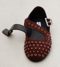 These ballet flats from Alaia are embellished with silver-tone eyelets. The burgundy design is made in Italy from suede with buckled crossover straps and barely-there rubber soles. Product Details - Upper: calf leather (suede) - Lining: leather - Sole: leather insole, rubber sole - Color: burgundy - Toe shape: round toe - Made in Italy - Includes: shoe box, dust bag - Designer color name: Ebene - Item color: brown - Hardware color: silver - Closure: buckle-fastening ankle strap - Item number: P01130196 Size & Fit - True to size - European sizes