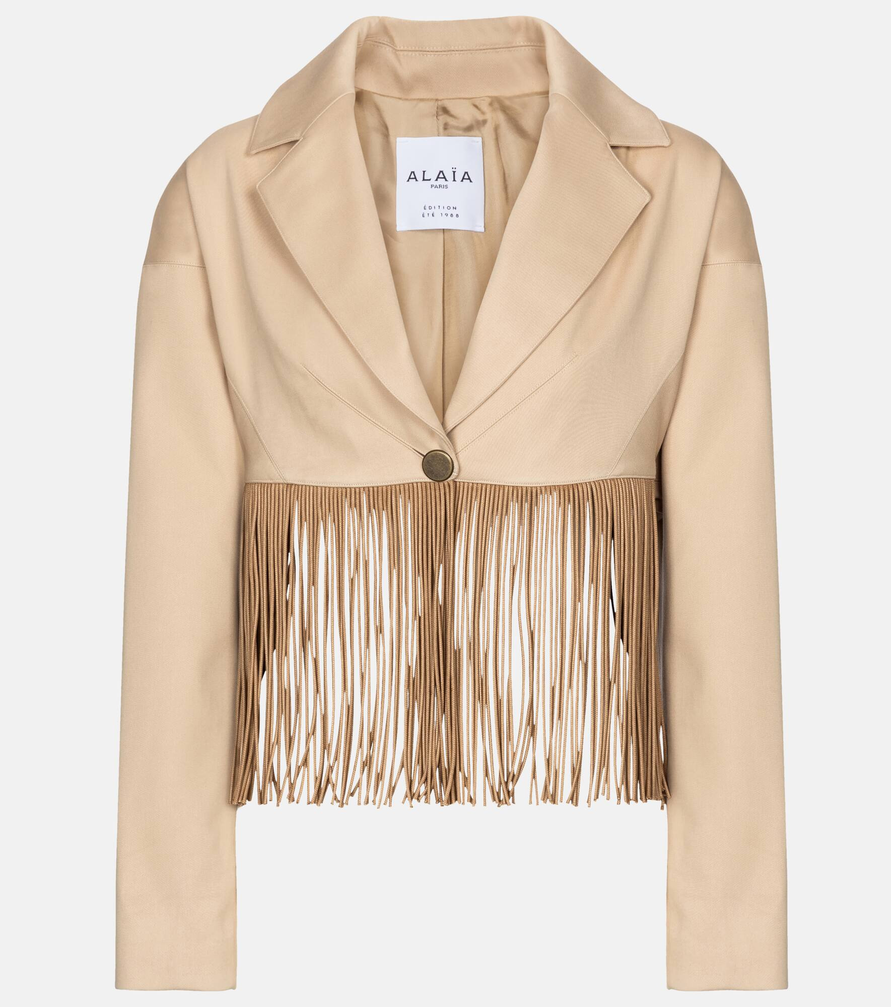 This cropped camel blazer from Alaïa is a cotton twill design that's revisited for a new generation with all the original styling. It has a single-button front and long fringed trim. Product Details - Made in France - Closure: buttoned front - Care instructions: dry clean - Designer color name: Sable - Material: 100% cotton - Item number: P00527634 Size & Fit - True to size - Dropped shoulders - Designed for a loose fit - Lightweight material - Slightly cropped - The model seen in the picture is 178cm-5'10" and wearing a size FR 36 - Length of fringe 22cm-8.5"