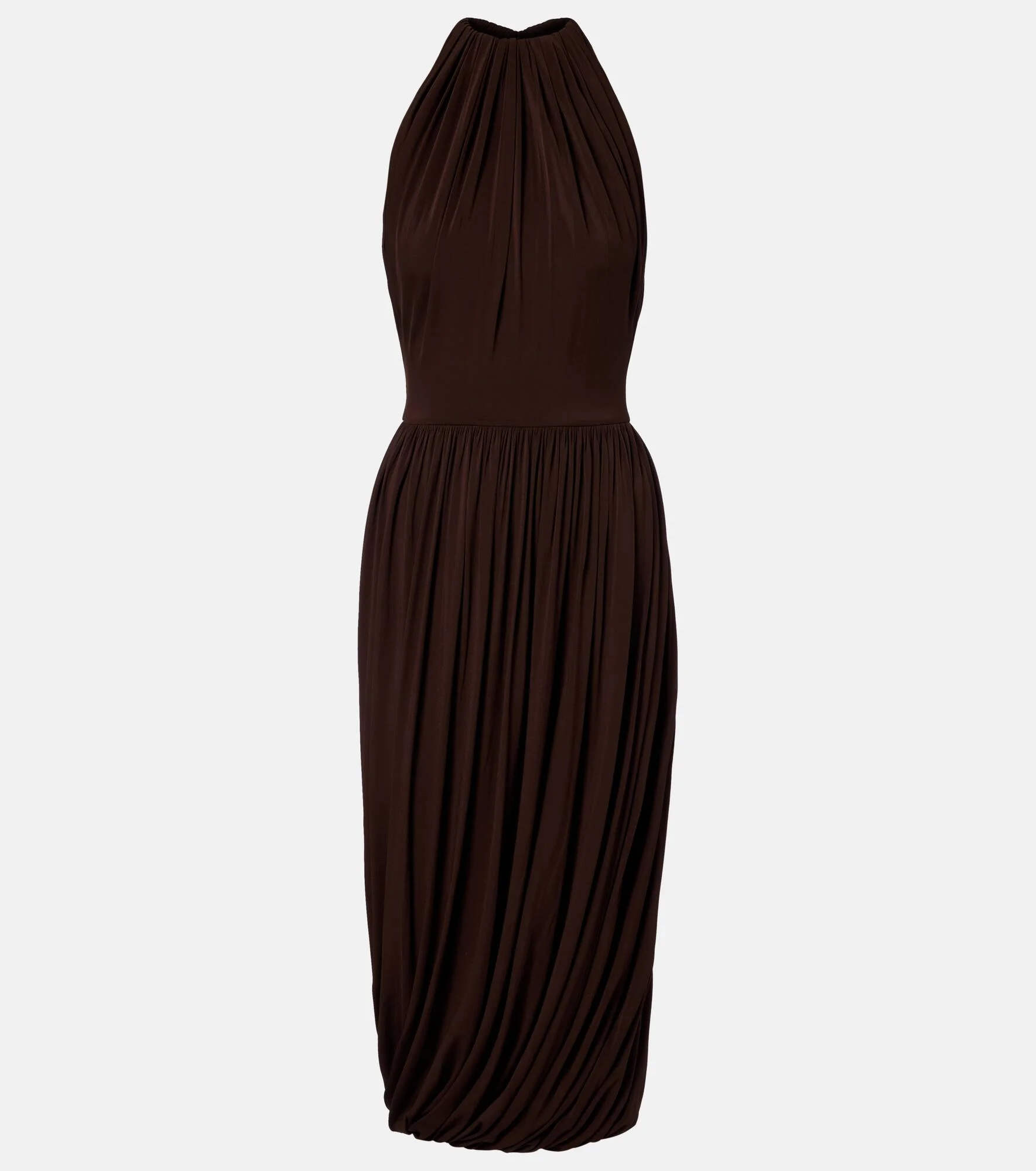 Upholding the legacy of Azzedine Alaia, the maison’s designs achieve an artful balance between sculptural and wearable. Crafted in Italy, this midi dress boasts a halter neckline and cinched waist with all-over pleating and gathered details. Product Details - Material: 96% viscose, 4% elastane - Care instructions: dry clean - Made in Italy - Color: brown - Designer color name: Ebene - Details: 65% polyester, 35% polyurethane - Closure: concealed zipped back - Item number: P01119276 Size & Fit - True to size - Cinched waist - Stretchy fabric - The model seen in the picture is 178cm-5'10" and wearing a size FR 34
