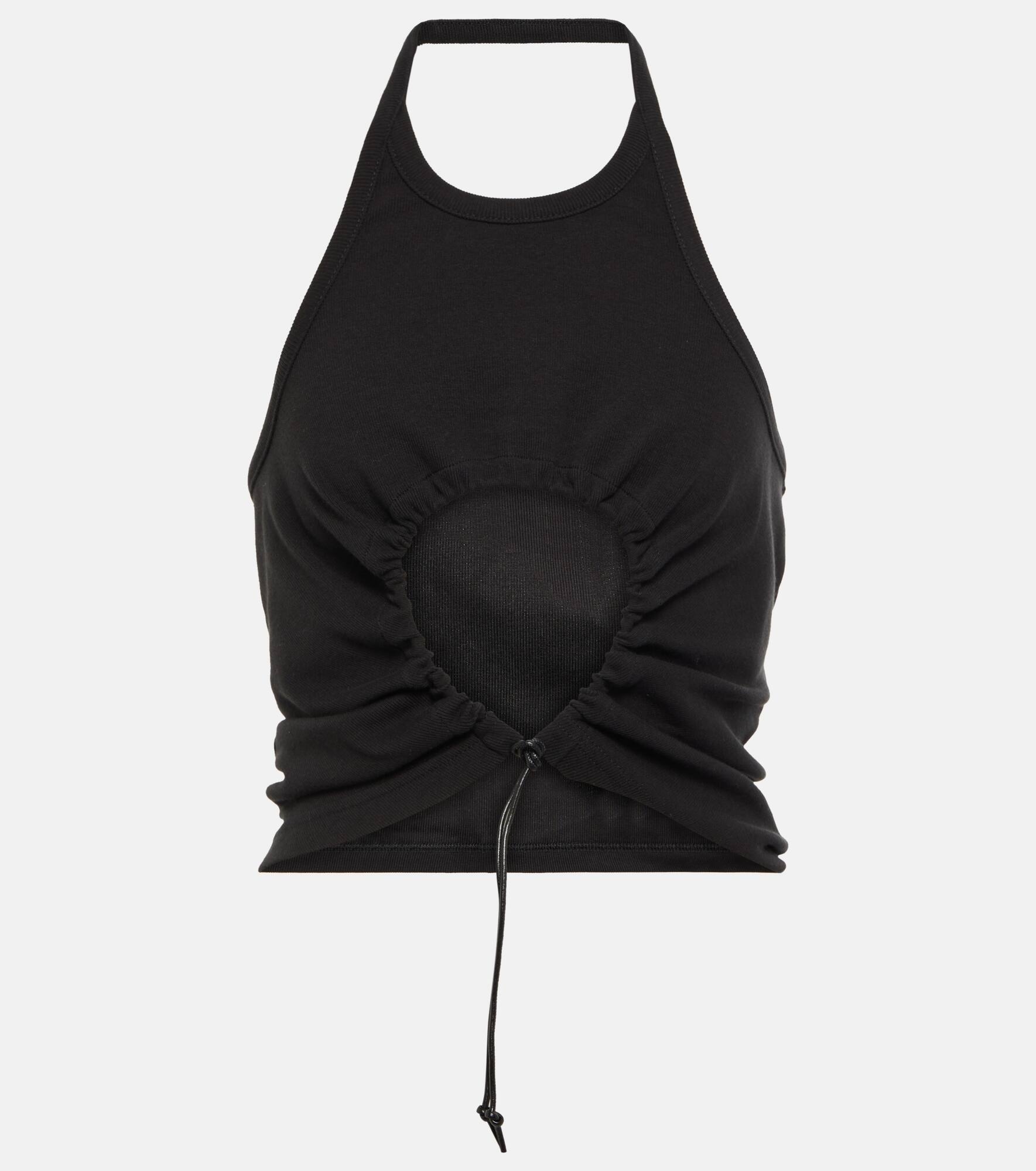 Versatile styling is a given with this ruched halter neck top from Alaïa. Designed by a brand known for carefully crafted pieces, this item is cropped and features a lamb-leather, self-tie cord. Product Details - Made in Italy - Details: 100% lamb leather - Care instructions: dry clean - Designer color name: Noir Alaia - Material: 100% cotton - Item number: P00746566 Size & Fit - True to size - Low back - Loose fit, drawstring waist - Cropped - The model seen in the picture is 178cm-5'10" and wearing a size FR 36