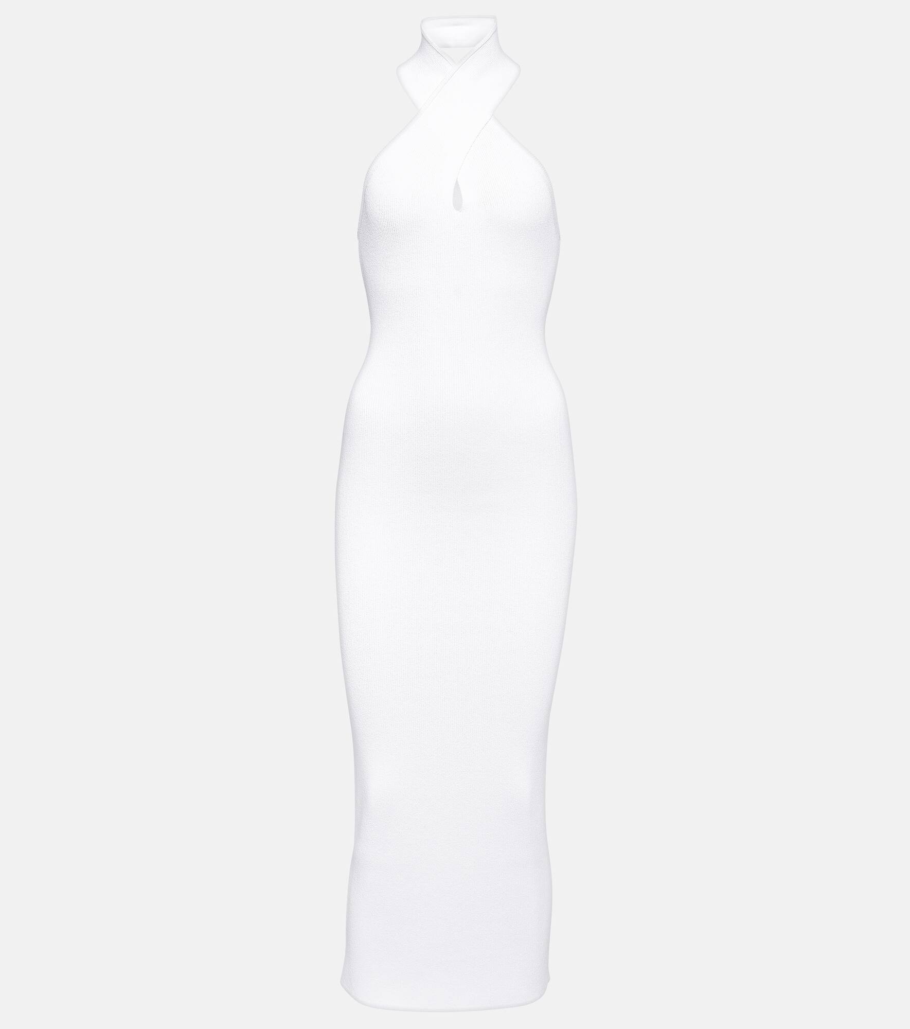 This minimalist midi dress from Alaïa comes in a fitted bodycon silhouette. Made in Italy, the white design features a crossover halterneck detail in the front. Product Details - Material: 75% viscose, 25% polyester - Care instructions: dry clean - Made in Italy - Designer color name: Blanc - Item number: P00846557 Size & Fit - True to size - Low back - Fitted - Mid-weight material - Stretchy fabric - The model seen in the picture is 178cm-5'10" and wearing a size FR 36