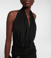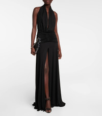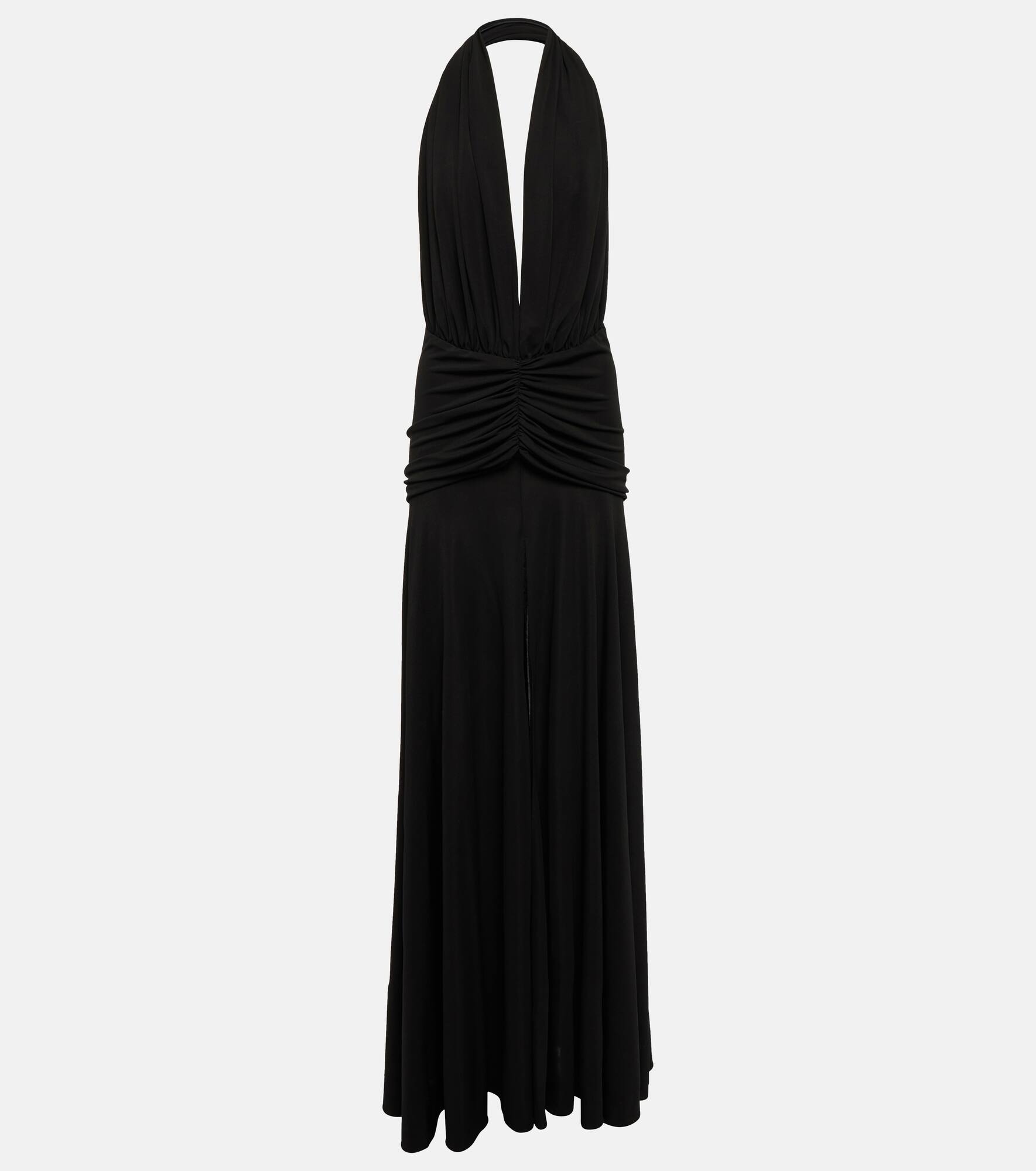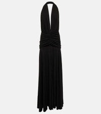 Eveningwear is now elevated with this chic halterneck gown from Alaïa. This piece will catch eyes with its deep V-neck, beautifully draped skirt, and ruched detailing that defines the waistline. Product Details - Material: 81% viscose, 19% polyamide - Made in Italy - Closure: zipped back - Designer color name: Noir Alaia - Care instructions: dry clean - Item number: P00752830 Size & Fit - True to size - Low back - Cinched waist - Mid-weight material - The model seen in the picture is 178cm-5'10" and wearing a size FR 36