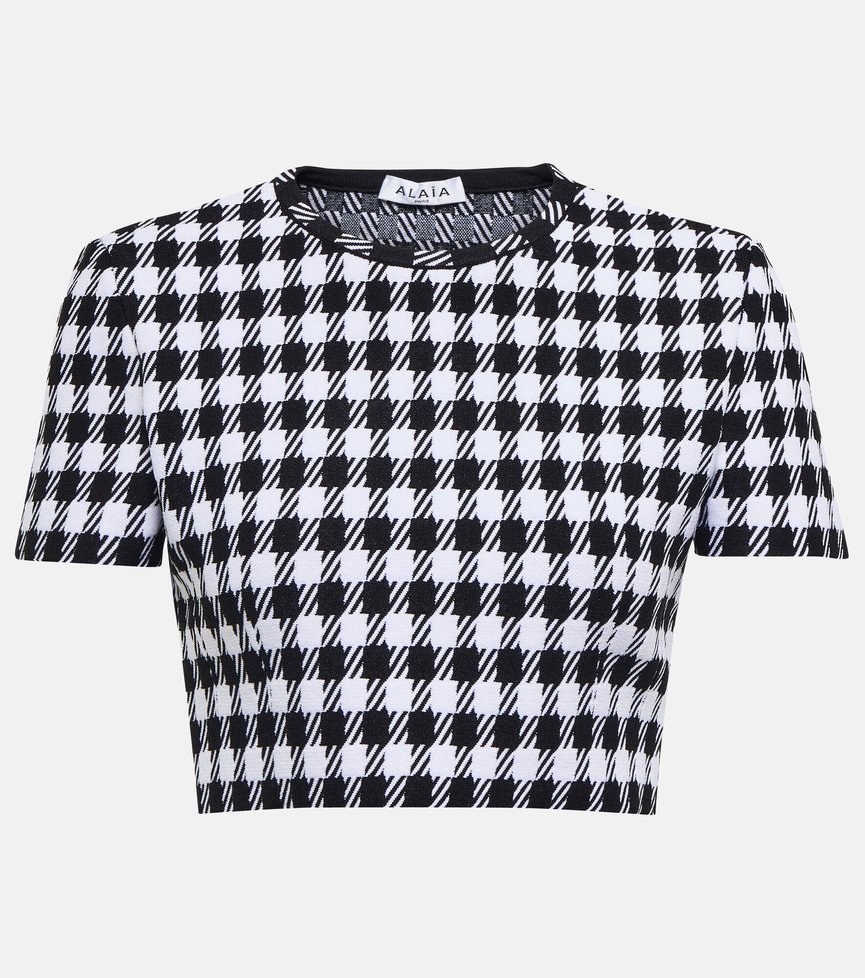 Add a graphic touch to your looks with this printed top from Alaïa, which arrives in a cropped silhouette and is printed with a Houndstooth motif. Product Details - Material: 9% polyester, 44% viscose, 4% elastane, 43% polyamide - Care instructions: dry clean - Made in Italy - Designer color name: Noir/Blanc - Item number: P00700977 Size & Fit - Fits small to size - we recommend trying one size larger - Fitted - Mid-weight material - Stiff material - Cropped - The model seen in the picture is 178cm-5'10" and wearing a size FR 38