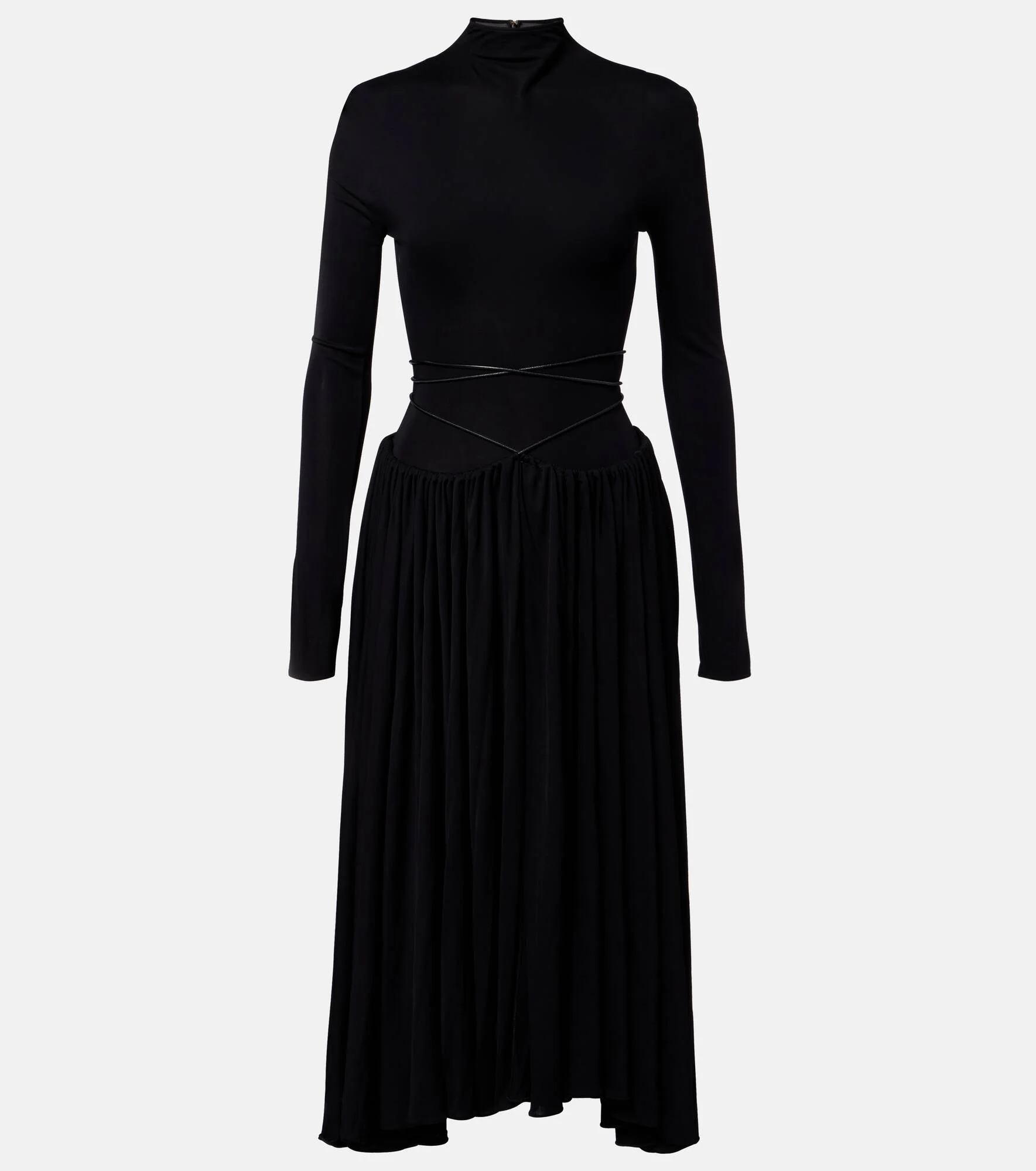 Upholding the legacy of Azzedine Alaia, the maison’s collections achieve an artful balance between sculptural and wearable. This jersey midi dress is designed with a voluminous skirt and a long-sleeved bodice wrapped in tonal laces. Product Details - Material: 100% viscose - Care instructions: dry clean - Made in Italy - Color: black - Designer color name: Noir Alaia - Closure: concealed zipped back, snap-buttoned fastenings, self-ties - Pockets: side slit pockets - Item number: P01118799 Size & Fit - True to size - Fitted bodice, loose skirt - Stretchy fabric - High-cut leg - The model seen in the picture is 178cm-5'10" and wearing a size FR 34