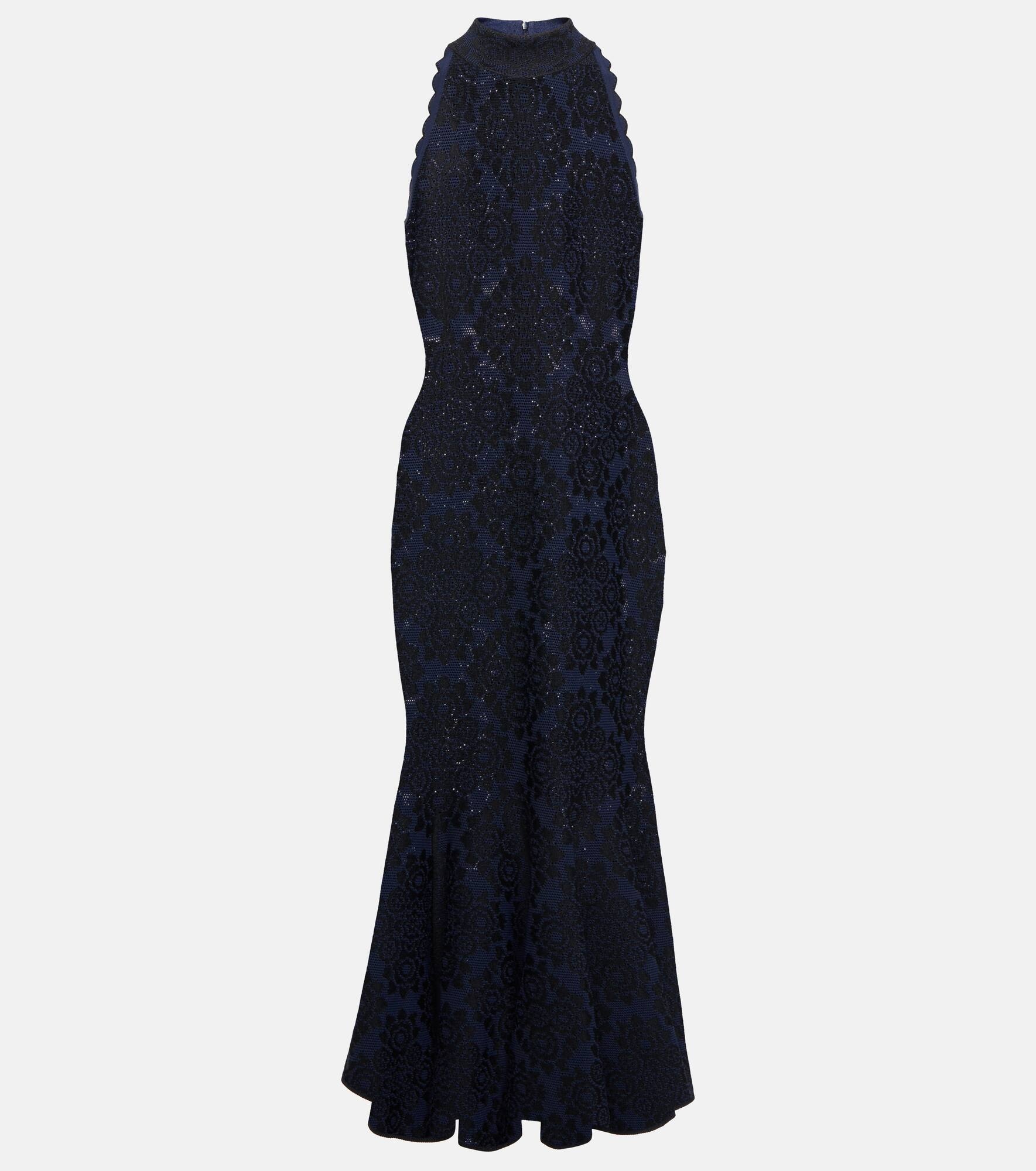 Made from a semi-sheer fabric, this midi dress from Alaïa has a high neck, scalloped edges and a fit-and-flare silhouette. Product Details - Made in Italy - Material: 7% polyester, 93% viscose - Closure: zipped back - Designer color name: Marine/Noir - Care instructions: do not wash - Item number: P00700889 Size & Fit - True to size - Semi-sheer - Fitted - Mid-weight material - Stretchy fabric - The model seen in the picture is 178cm-5'10" and wearing a size FR 36