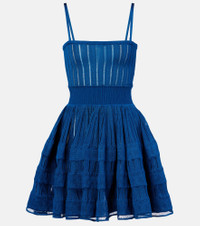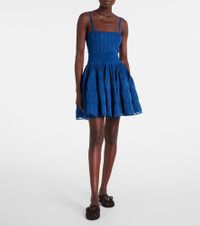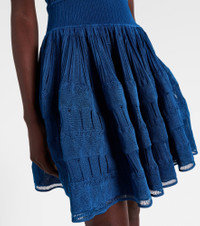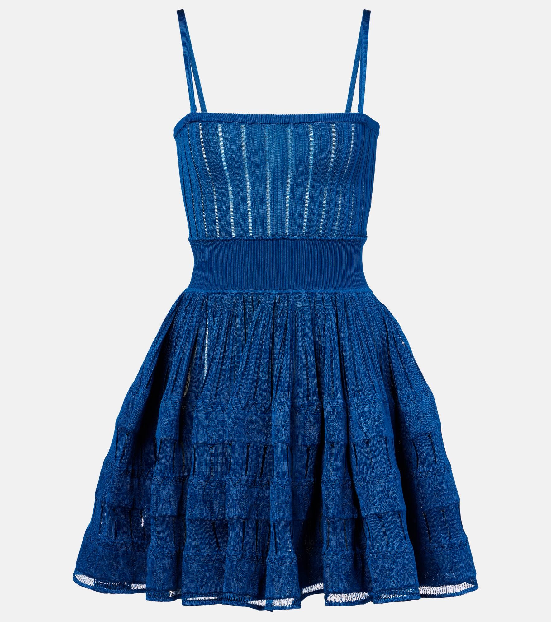 This minidress from Alaia brings effortless sophistication into your wardrobe. Made from a knitted fabric, the style features a form-fitting bodice that flows into a flared skirt for added dimension. Product Details - Material: 100% viscose - Care instructions: dry clean - Made in Italy - Designer color name: Bleu Canard - Item color: blue - Material II: 84% viscose, 14% polyamide, 2% elastane - Trim: 90% viscose, 6% polyamide, 4% elastane - Item number: P01047453 Size & Fit - Fits large to size - we recommend trying one size smaller - Cinched waist - Stretchy fabric - The model seen in the picture is 178cm-5'10" and wearing a size FR 34