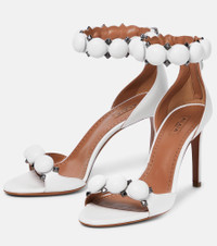 Alaïa's signature La Bombe sandals balance an elegant form and tough-luxe metal finishes. They are crafted in Italy from leather with hemispherical and pyramid-shaped studs, and have 90mm stiletto heels. Product Details - Toe shape: round open toe - Lining: leather - Upper: lamb leather - Sole: leather insole and sole - Closure: zipped back - Designer color name: Blanc Casse - Made in Italy - Item number: P00635010 Size & Fit - True to size - European sizes - 9,5cm-3.5" heel (size EU 38)