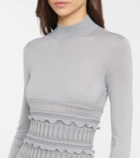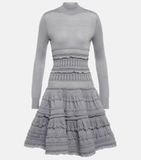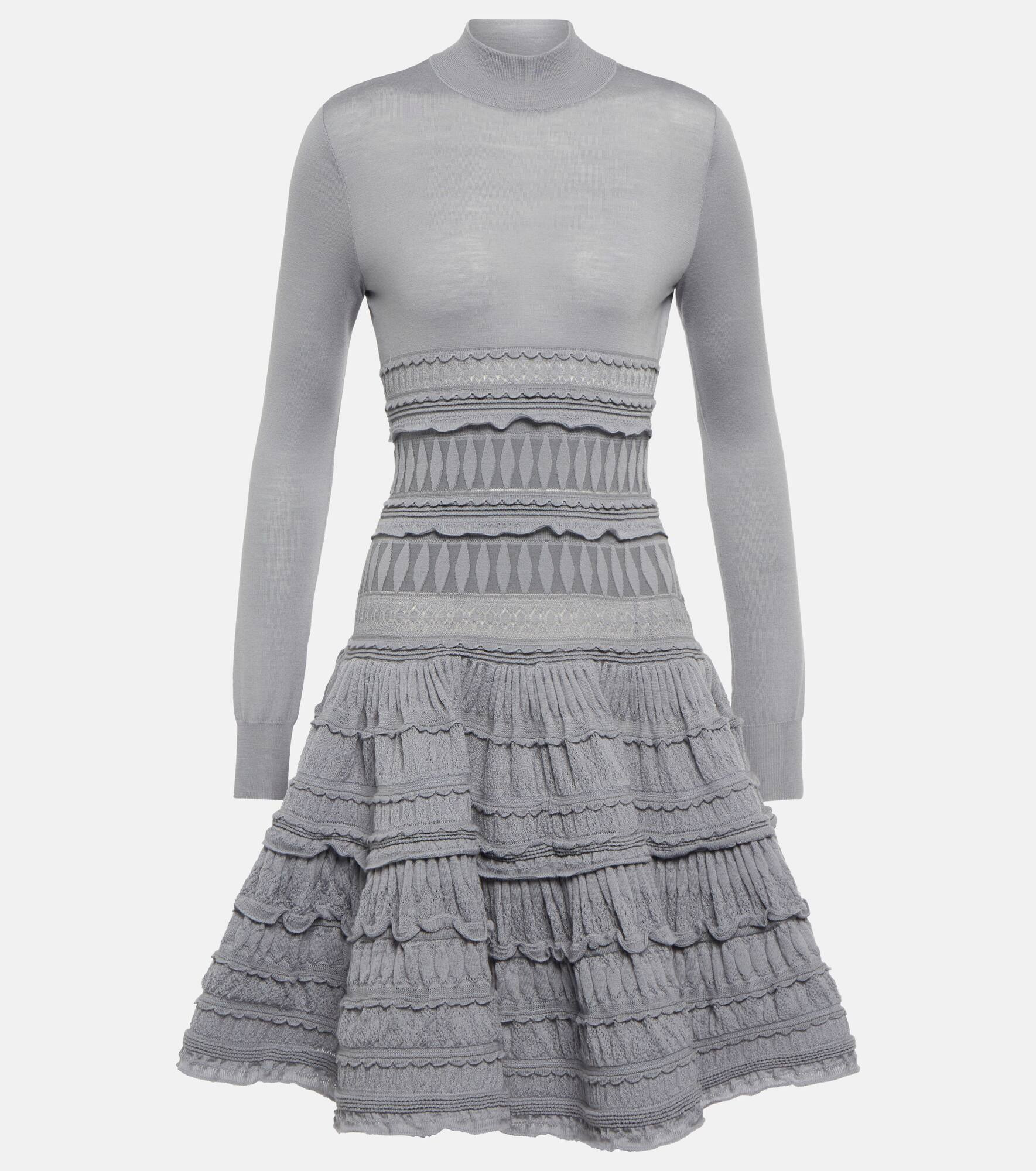 Master Alaïa's sculptural design language with this body-hugging dress that falls into a voluminous skirt from the hips down. This long-sleeved design is made from a wool-blend knit with intricate openwork lace panels and ruffles in sophisticated gray. Product Details - Material: 1% polyester, 5% polyamide, 92% wool, 2% elastane - Care instructions: dry clean - Made in Italy - Designer color name: Gris - Item number: P00629284 Size & Fit - True to size - Fitted bodice, loose skirt - Mid-weight material - Stretchy fabric - The model seen in the picture is 178cm-5'10" and wearing a size FR 36