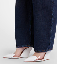 Aptly named for the heart-shaped appliques at the razor-sharp profiles, the Le Cœur mules from Alaia are an elegant pair. Set on 90mm wedge heels, they’re made from glossy patent leather and transparent PU paneling and straps. Product Details - Upper: synthetic material, leather - Lining: leather, synthetic material - Sole: leather insole, leather and rubber sole - Color: white - Toe shape: pointed toe - Made in Italy - Includes: shoe box, dust bag - Designer color name: Blanc Optique - Item color: white, transparent - Item number: P01130157 Size & Fit - True to size - Slightly narrow at the back - European sizes - 9cm-3.5" wedge heel