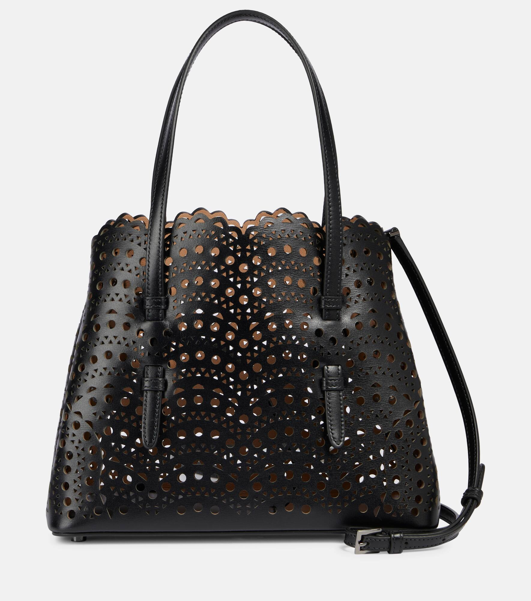 Perforated with Alaïa's Vienne Wave motif, the Le Mina 25 tote is an elegant everyday essential. Made from calf leather, it’s framed by a scalloped trim that expands at the sides for practical perfection. Product Details - Made in Italy - Material: calf leather - Protective feet - Designer color name: Noir - Color of fastening: anthracite - Internal details: suede lining, internal zipped pouch - Closure: open top - Comes with dust bag - Detachable, adjustable shoulder strap, Top handles - Item number: P00566591 Size & Fit - Height 19,5cm-7.5" - Width 25cm-10" - Depth 12,5cm-5" - Length of handles 42cm-16.5" - Min. length shoulder strap 110cm-43.5" - Max. length shoulder strap 125cm-49" - Clutch height 14cm-5.5" - Clutch width 8,5cm-3.5"