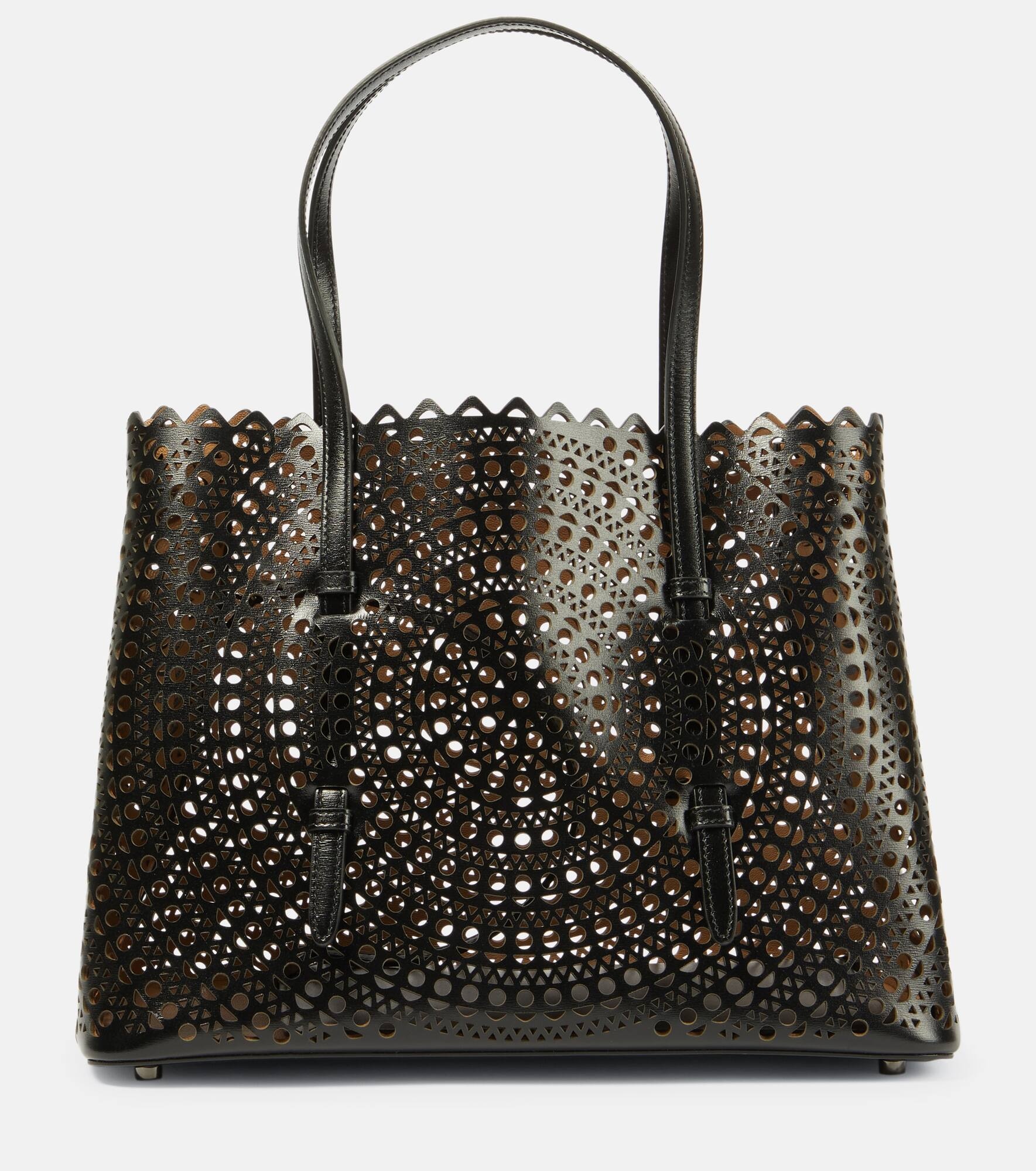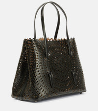 Alaïa’s Le Mina 20 Mini tote is characterized by the label's signature laser-cut New Vienne motifs. Made from smooth black leather with laced-though top handles, it's a design that will effortlessly segue into any edit. Product Details - Detachable zipped pouch - Made in Italy - Designer color name: Noir - Top handles - Material: calf leather - Internal details: leather lining - Closure: open top - Protective feet - Item number: P00688228 Size & Fit - Height 25cm-10" - Width 32cm-12.5" - Depth 16cm-6.5" - Length of handles 40cm-15.5" - Clutch height 14cm-5.5" - Clutch width 24cm-9.5"
