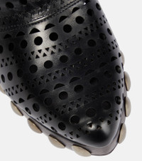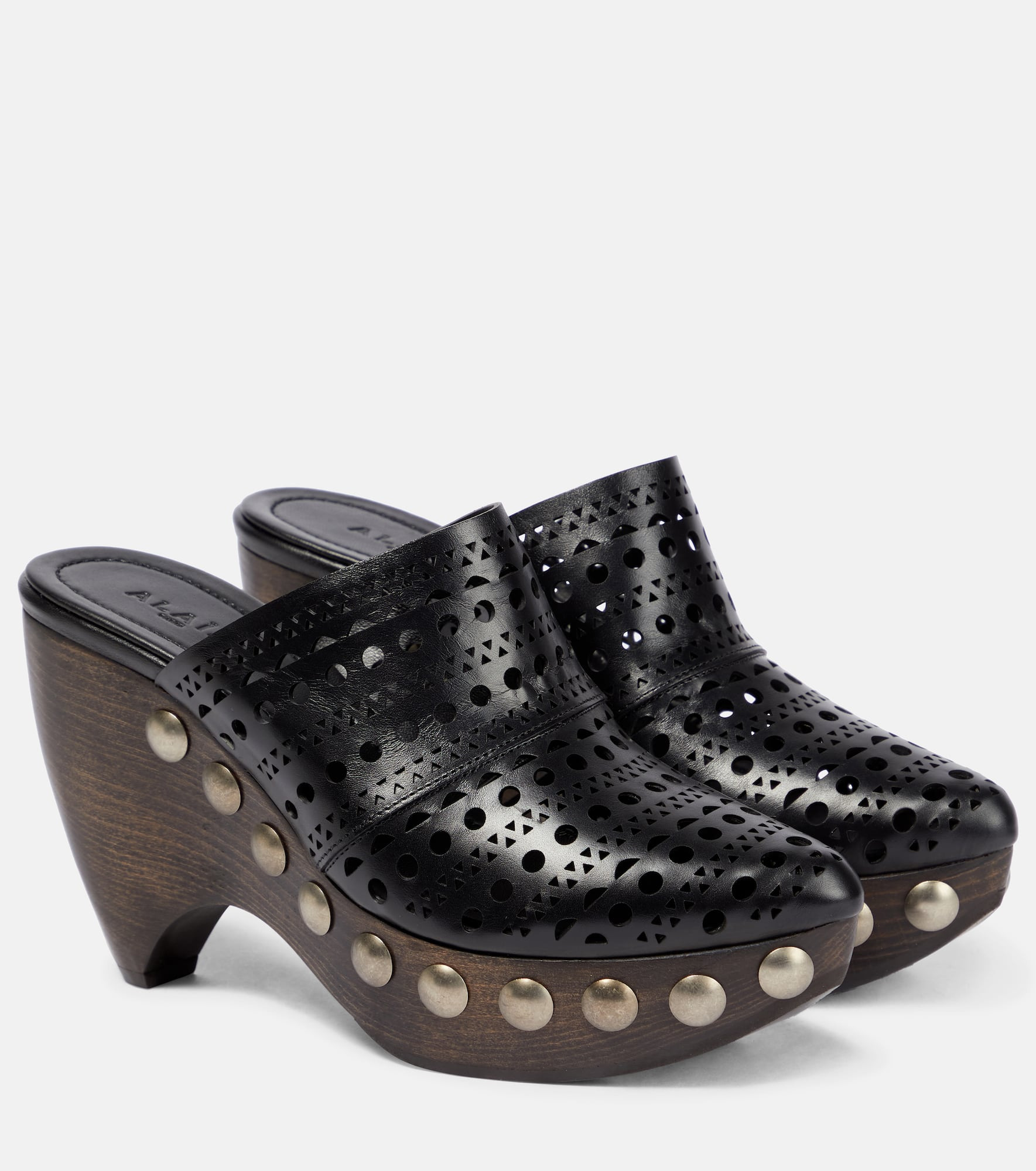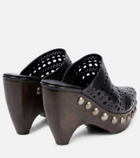 Alaïa elevates the clog mules with laser-cut leather uppers in the brand's signature Vienne openwork design. They're set atop studded wooden platform soles with curved heels. - upper: calf leather - lining: leather - sole: leather insole, leather and rubber sole - almond toe - Made in Italy - Designer colour name: Noir