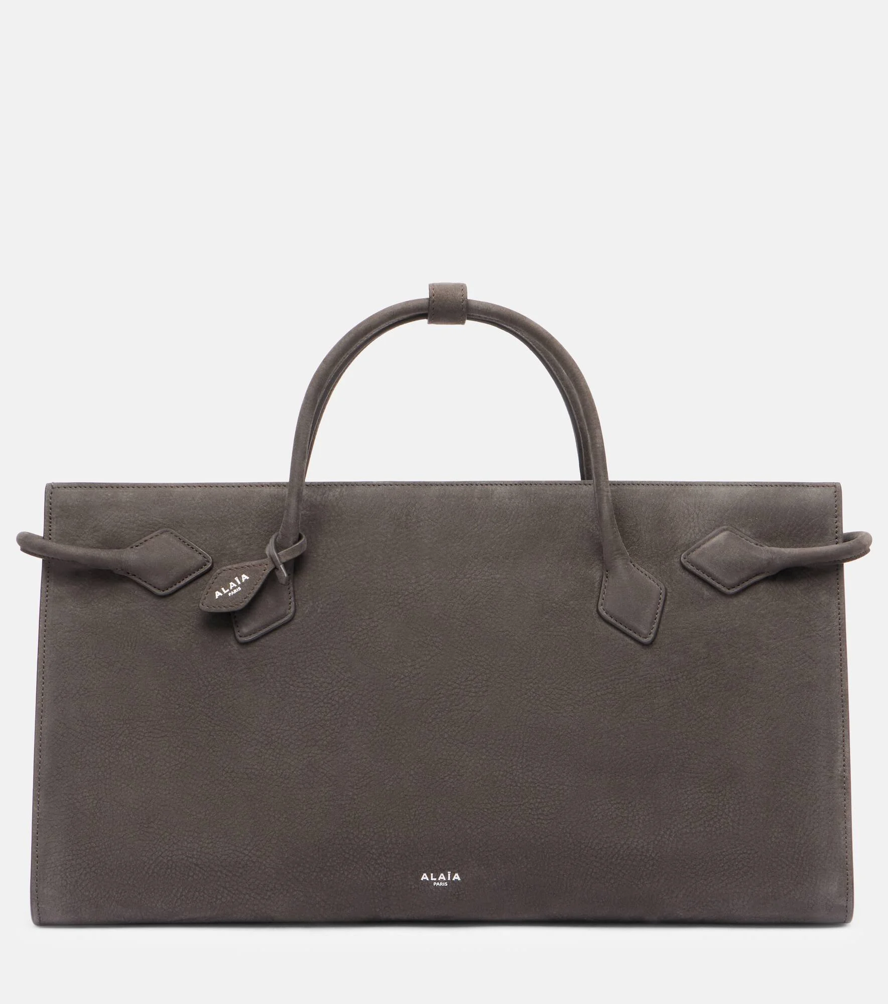Boasting an instantly recognizable silhouette, Alaia's Le Teckel shoulder bag is an iconic addition to your collection. This Large iteration is crafted from smooth leather with top handles and a zipped top. Product Details - Material: leather - Lining: suede - Made in Italy - Designer color name: Anthracite - Item color: gray - Internal details: internal slot pocket - Top handles - Item number: P01076221 Size & Fit - Height 24cm-9.5" - Width 43cm-17" - Depth 16cm-6.5" - Length of handles 36cm-14"
