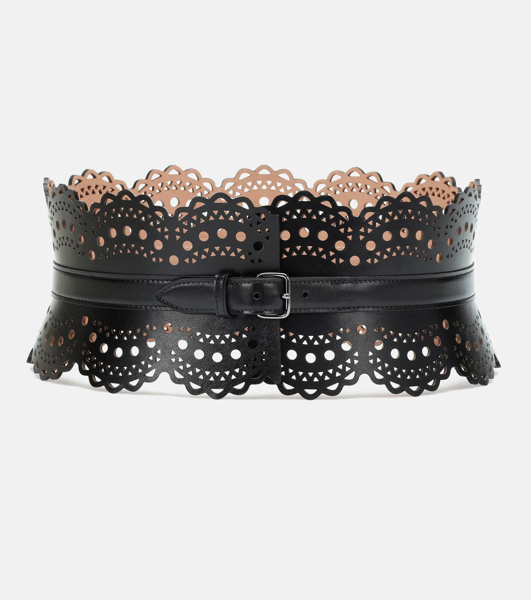 Let Alaïa's luxurious approach to design permeate every part of your wardrobe by investing in unique accessories such this corset belt. The design has been crafted in Italy from smooth calf leather in black, and its wide strap is enriched with laser-cut details. Cinch yours over printed dresses for a figure-flattering finish. Product Details - Internal details: suede lining - Material: leather - Comes with dust bag - Made in Italy - Item number: P00422968 Size & Fit - Width 11,5cm-4.5"