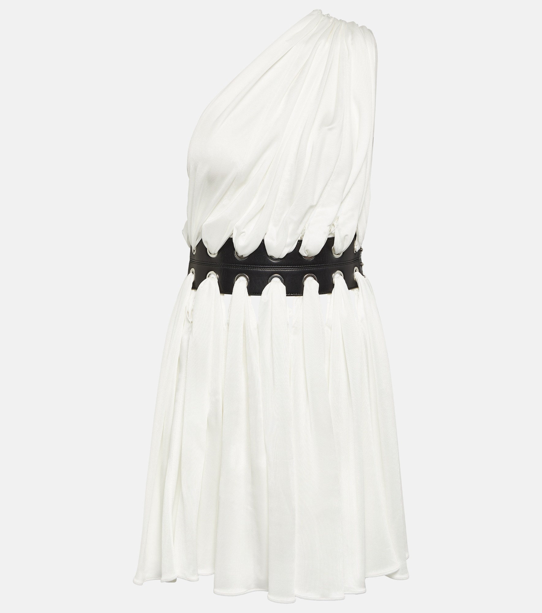 This minidress shows Alaïa’s unique character and craftsmanship. Made from lightweight fabric, the one-shoulder design comes with a leather belt and silver-toned eyelets. Product Details - Material: 81% viscose, 19% polyamide - Made in Italy - Care instructions: specialist clean - Designer color name: Blanc - Other inner trims: 100% polyester - Material II: 100% lamb leather - Contains non-textile parts of animal origin - Item number: P00752793 Size & Fit - True to size - Cinched waist - Heavy material - The model seen in the picture is 178cm-5'10" and wearing a size FR 36