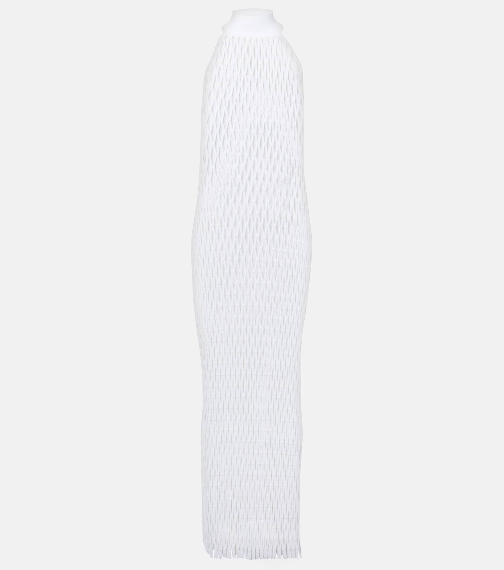 This macrame maxi dress from Alaia makes a statement with its open-knit design and ribbed high neck. Featuring frayed hems and a fitted silhouette, it blends intricate craftsmanship with contemporary elegance. Product Details - Material: 66% viscose, 24% polyester, 7% linen, 2% polyamide, 1% elastane - Care instructions: dry clean - Made in Italy - Designer color name: Blanc - Item color: white - Material II: 72% viscose, 24% polyester, 4% polyamide - Item number: P01018669 Size & Fit - True to size - Close fit at the neck - Semi-sheer - Straight fit - Non-stretchy fabric - The model seen in the picture is 178cm-5'10" and wearing a size FR 36