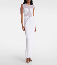 Impress at events in this daring yet delicate maxi dress from Alaia. Made in Italy, the ankle-length piece has a fitted silhouette and features sheer inlays that trace the contours of the design. Product Details - Material: 94% viscose, 6% polyester - Care instructions: dry clean - Made in Italy - Designer color name: Blanc - Item color: white - Closure: invisible zipper - Item number: P01018817 Size & Fit - Fits small to size - we recommend trying one size larger - Fitted - Stretchy fabric - The model seen in the picture is 178cm-5'10" and wearing a size FR 36