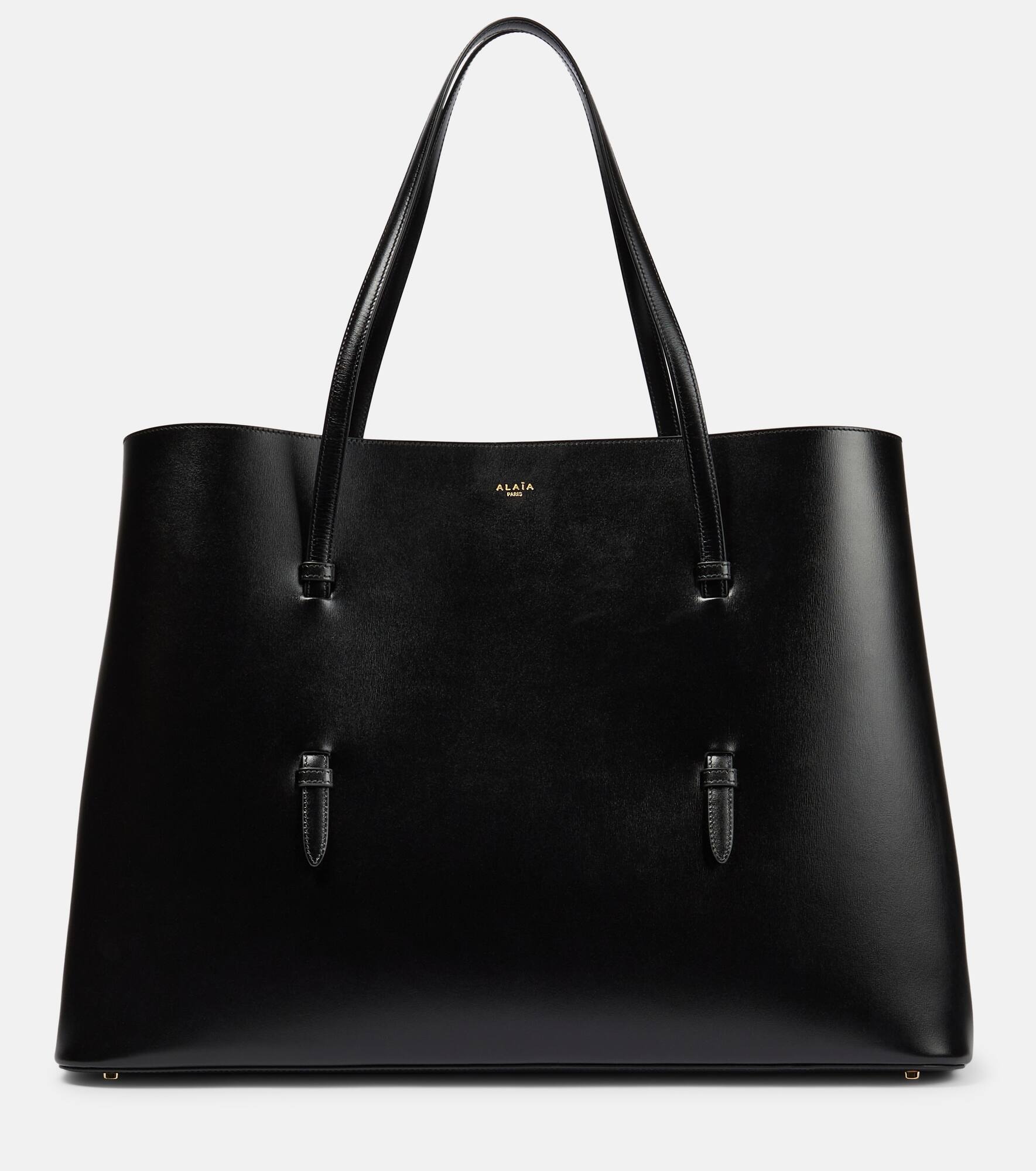 Alaïa opts for a sleek silhouette for this iteration of the Mina 50 Large tote bag. Made in Italy from calf leather, the thin top handles are braided through the body to add dimension to the tonal design. Product Details - Internal details: internal zipped pouch, leather lining - Made in Italy - Designer color name: Noir - Material: cow leather - Closure: open top - Item number: P00752509 Size & Fit - Height 35cm-14" - Width 50cm-19.5" - Depth 20cm-8" - Length of handles 52cm-20.5" - Clutch height 14cm-5.5" - Clutch width 24cm-9.5"