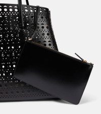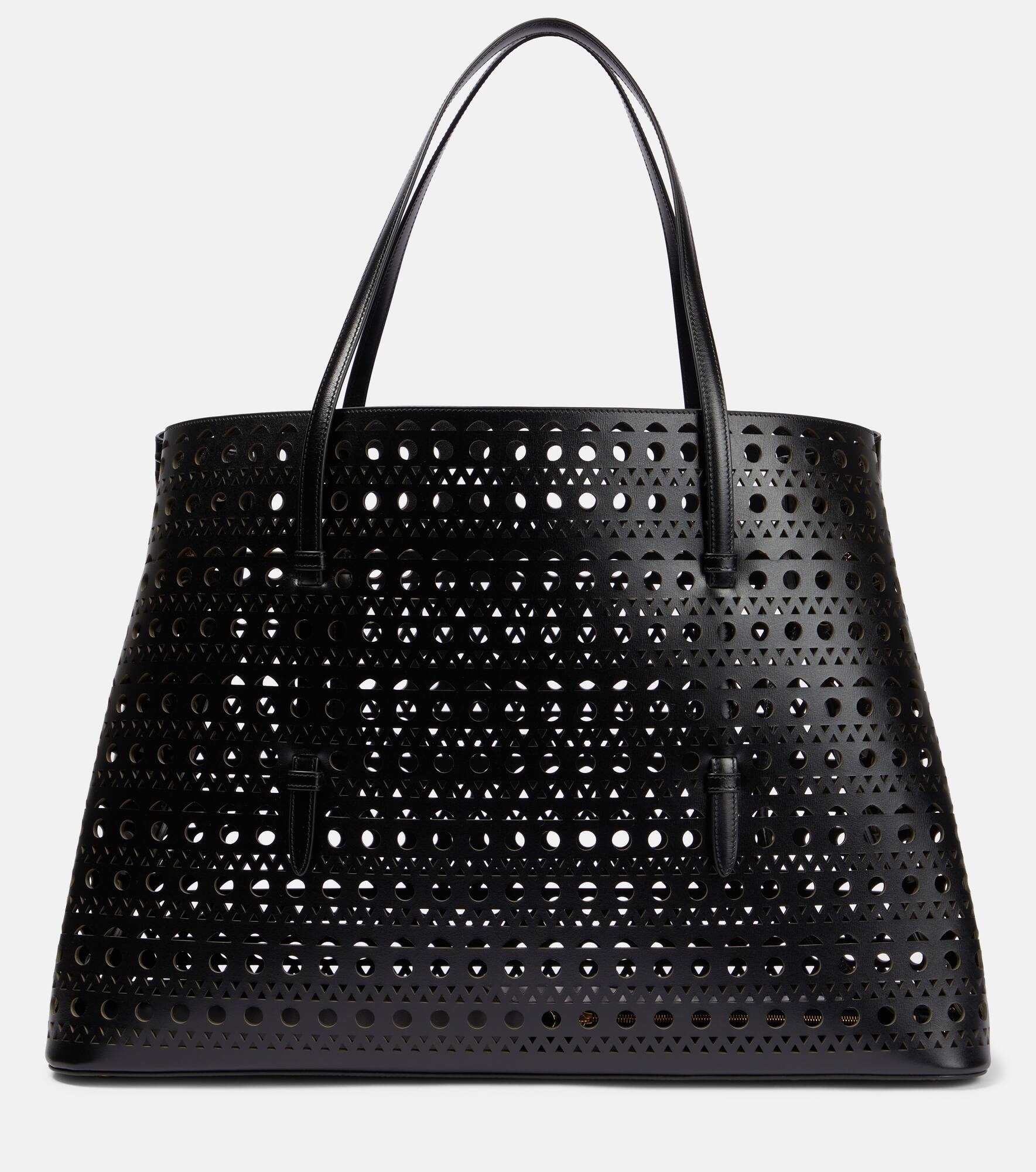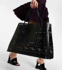 Alaïa opts for a sleek silhouette for this iteration of the Mina 50 Large tote bag. Made in Italy from calf leather, this piece features thin top handles braided through the body to add dimension to the tonal design. Product Details - Made in Italy - Comes with dust bag, Comes with a box - Designer color name: Noir - Internal details: internal zipped pouch, leather lining - Material: leather - Top handles - Closure: open top - Item number: P00752510 Size & Fit - Height 34,5cm-13.5" - Depth 20cm-8" - Length of handles 67cm-26.5" - Clutch height 14cm-5.5" - Clutch width 24cm-9.5"