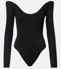 Upholding the legacy of Azzedine Alaia, the maison’s collections achieve an artful balance between sculptural and wearable. This cinched bodysuit is crafted from soft jersey, featuring a structured off-shoulder silhouette supported by internal boning. Product Details - Material: 96% viscose, 4% elastane - Care instructions: dry clean - Made in Italy - Color: black - Designer color name: Noir Alaia - Material II: 82% polyamide, 18% elastane - Boning - Closure: snap-buttoned fastenings - Item number: P01118817 Size & Fit - Fits small to size - we recommend trying one size larger - Off-the-shoulder - Internal boned corset for support - Fitted - Partly stretchy fabric - High-cut leg - Height of model is 175cm-69" and wears a size FR 36
