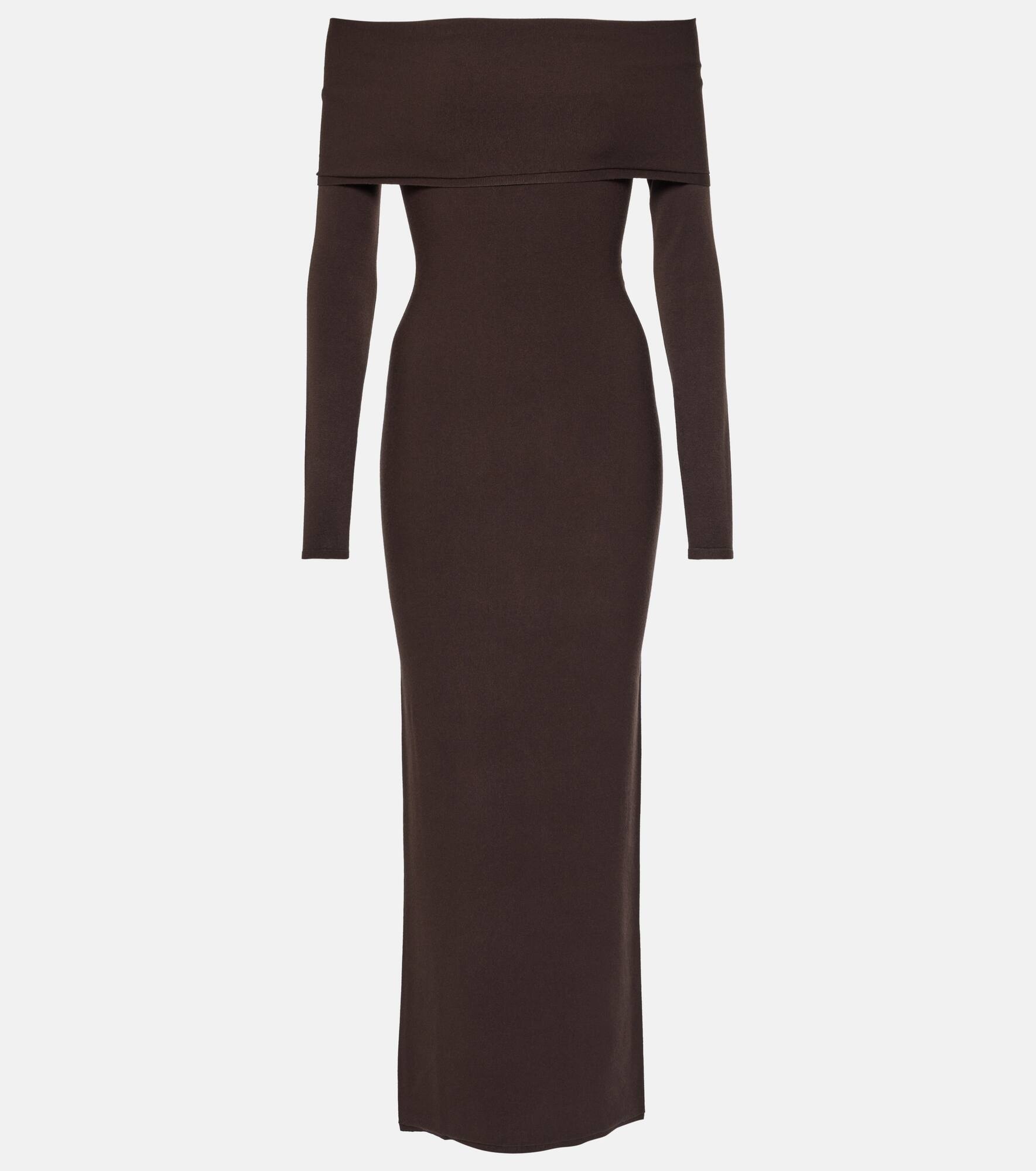 Defined by a form-flattering jersey construction, this dress from Alaïa makes an alluring addition to your edit. The midi-length design is presented in an earthy brown shade, and stands out in an off-shoulder band which drapes elegantly over the sleeves. Product Details - Material: 67% viscose, 33% polyester - Care instructions: dry clean - Made in Italy - Designer color name: Marron Fonce - Item number: P00846503 Size & Fit - Fits small to size - we recommend trying one size larger - Off-the-shoulder - Fitted - Mid-weight material - Stretchy fabric - The model seen in the picture is 178cm-5'10" and wearing a size FR 38
