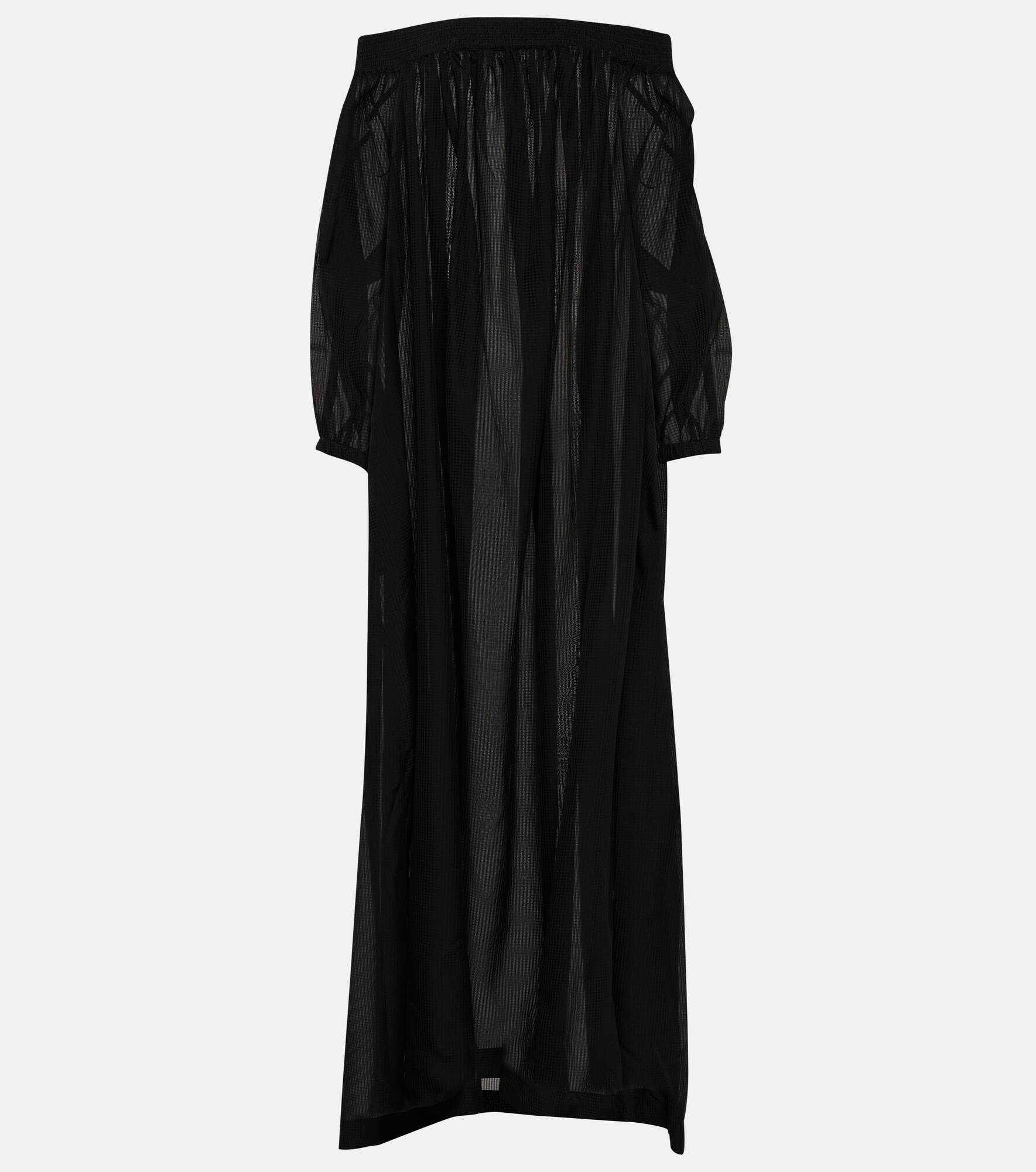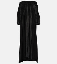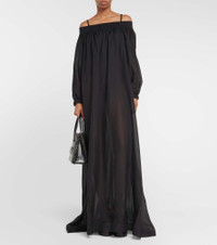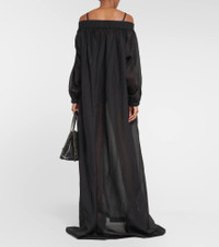 Crafted from a lightweight silk-blend fabric, this Alaïa maxi dress features an off-shoulder neckline, a flowy silhouette, and billowy sleeves. Product Details - Material: 30% silk, 70% viscose - Made in Italy - Pockets: side slit pockets - Designer color name: Noir Alaia - Care instructions: specialist clean - Elasticated cuffs - Item number: P00820607 Size & Fit - True to size - Designed for an extremely oversized fit - Off-the-shoulder - Sheer - Lightweight material - The model seen in the picture is 178cm-5'10" and wearing a size FR 36