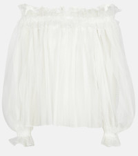 This white Alaïa blouse is made entirely from paneled lace-like mesh that creates a subtle, sheer effect. The peasant-style silhouette sits off the shoulders with blouson sleeves and ruffle trims. Wear yours with the house's corset belts. Product Details - Made in Italy - Care instructions: dry clean - Elasticated cuffs - Designer color name: Blanc - Material: 100% polyester - Item number: P00572946 Size & Fit - True to size - Off-the-shoulder - Semi-sheer - Designed for a loose fit - Lightweight material - Falls to the hip - The model seen in the picture is 178cm-5'10" and wearing a size FR 36