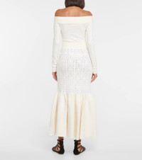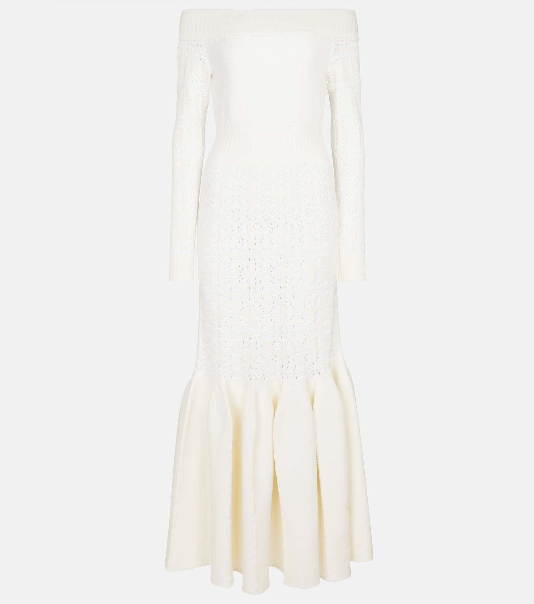 Invest in this ivory-white Alaïa maxi dress for a showstopping entrance, whether as a contemporary bride or soirée guest. Loosely knit, it's trimmed with cream-white velvet for cinching effect at the off-shoulder neckline, waist and cuffs. The pleated fishtail hemline is sure to keep all eyes on your ensemble. Product Details - Made in Italy - Closure: zipped side - Material: 9% polyester, 19% polyamide, 70% viscose, 2% elastane - Care instructions: dry clean - Item number: P00573016 Size & Fit - True to size - Off-the-shoulder - Fitted - Heavy material - The model seen in the picture is 178cm-5'10" and wearing a size FR 36