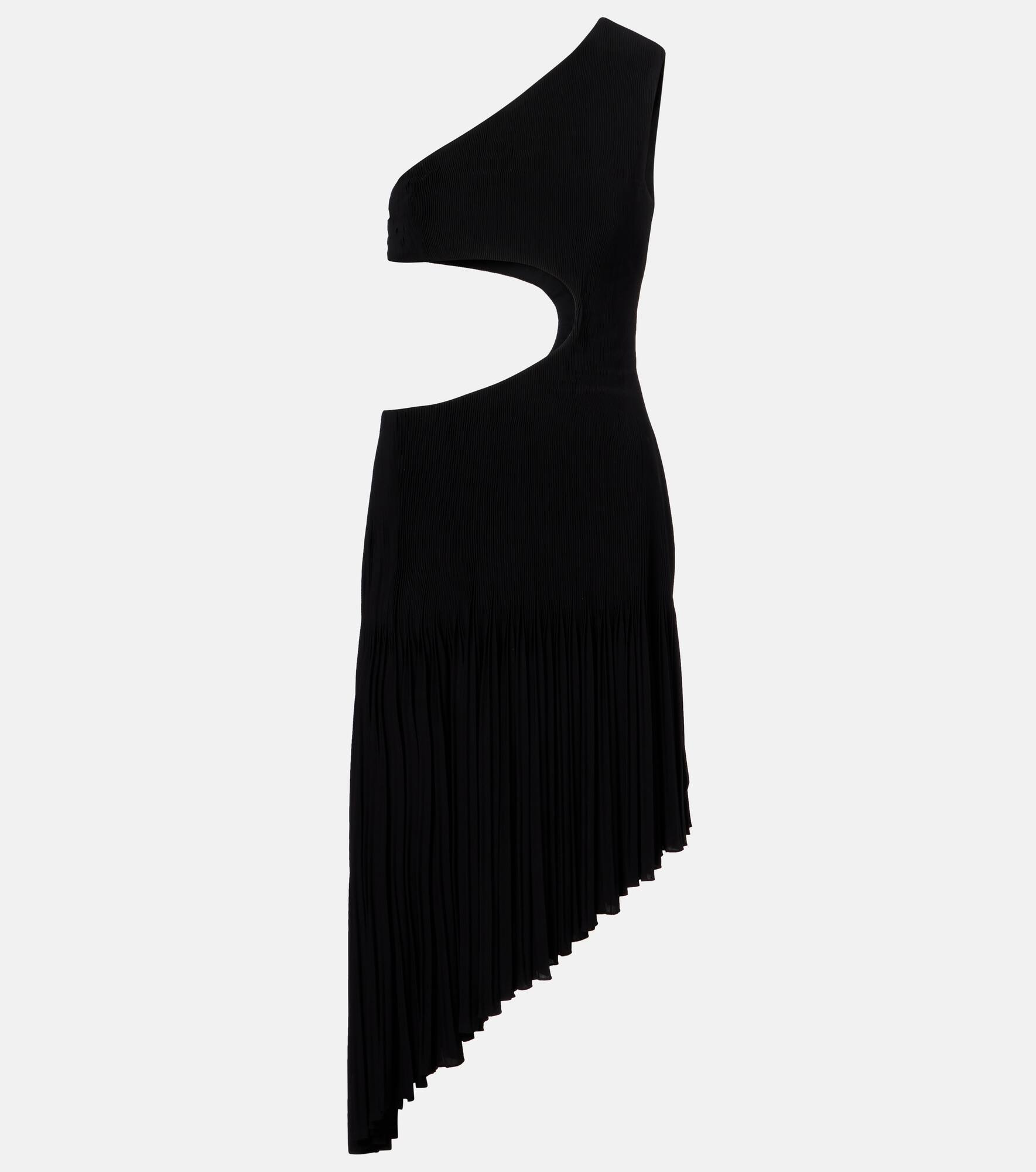 Honoring Azzedine Alaia’s legacy, the maison’s sculptural yet wearable collections hold an artful balance that only the most skilled designers can achieve. This one-shoulder midi dress boasts alluring cutout details. Product Details - Material: 96% viscose, 4% elastane - Care instructions: specialist clean - Made in France - Designer color name: Noir Alaia - Item color: black - Lining: 96% viscose, 4% elastane - Closure: concealed zipper, zipped side, snap-buttoned fastenings - Item number: P01047504 Size & Fit - True to size - Fitted bodice, loose skirt - Slightly stretchy fabric - Height of model is 175cm-69" and wears a size FR 36