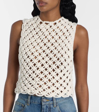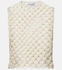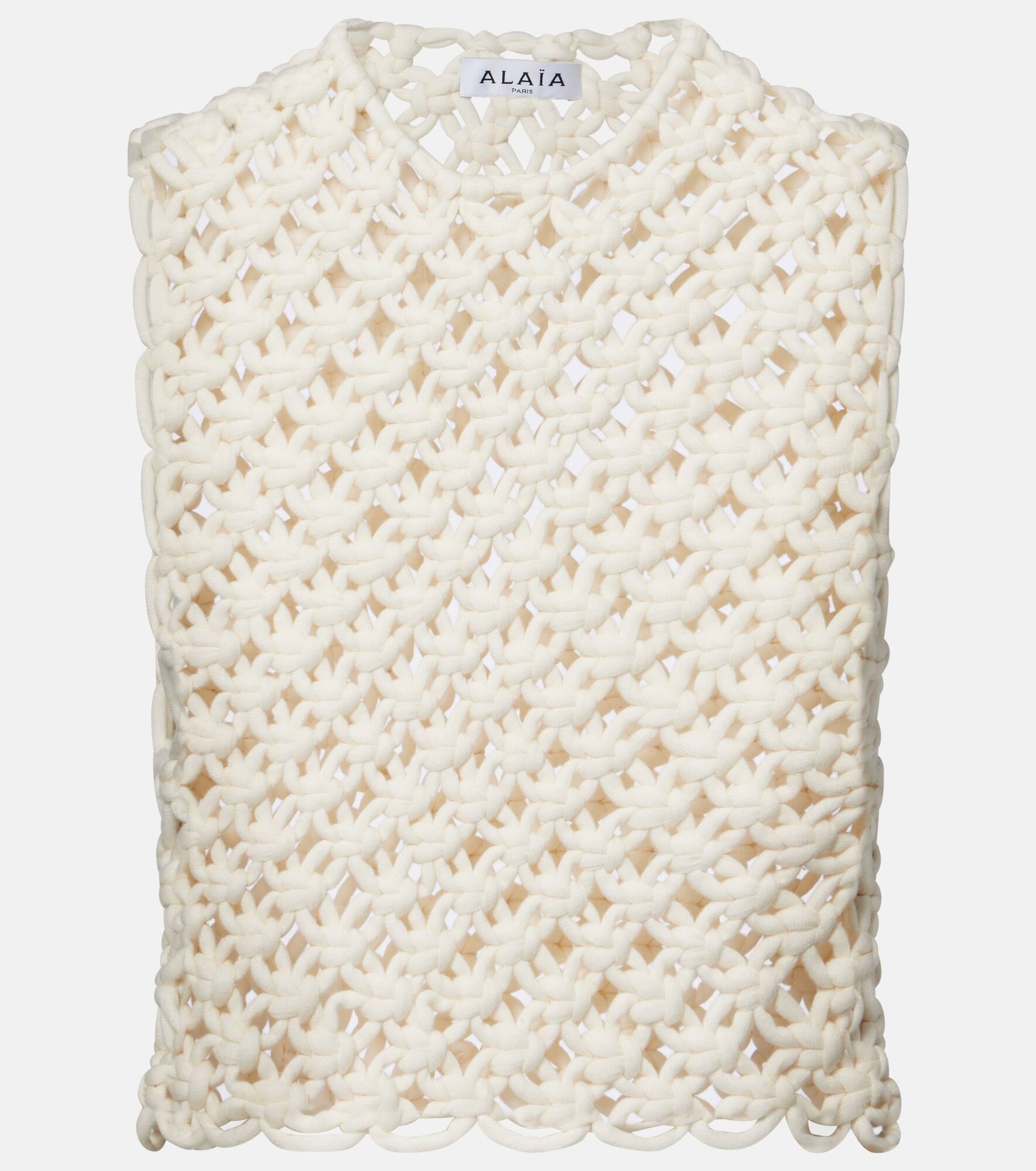 Honoring Azzedine Alaia’s legacy, the maison blends sculptural design with effortless wearability. This sleeveless open-knit top is crafted from pure cotton, showcasing the brand’s refined craftsmanship. Product Details - Material: 62% cotton, 38% polyamide - Care instructions: dry clean - Made in Madagascar - Designer color name: Blanc Naturel - Item color: white - Item number: P01047434 Size & Fit - True to size - Semi-sheer - Straight fit - Stretchy fabric - Cropped - The model seen in the picture is 178cm-5'10" and wearing a size FR 36