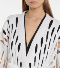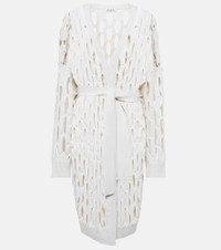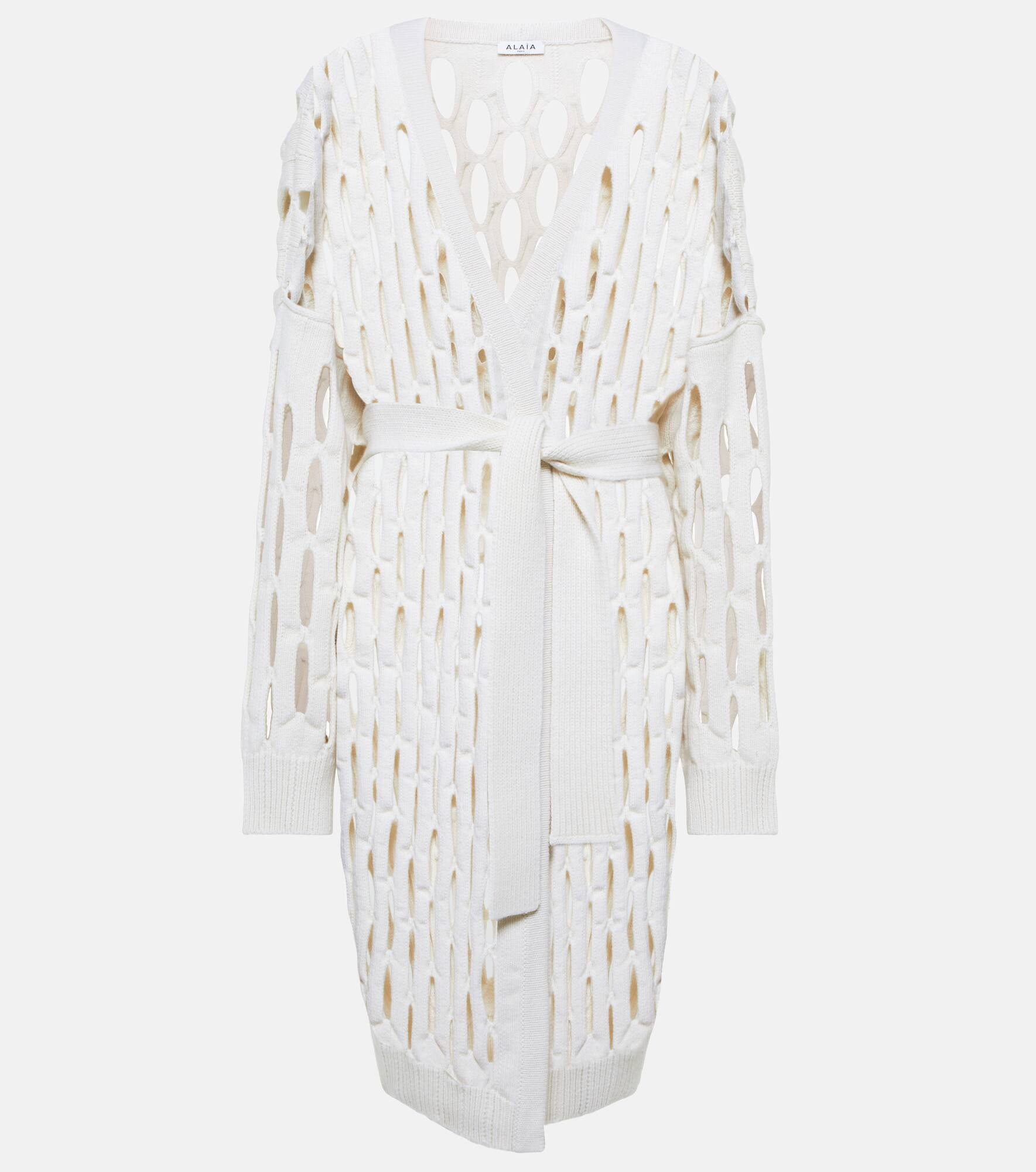 This Alaïa cardigan is made from virgin wool with lattice-lace open-work that creates a contemporary, perforated effect. Layer it over the brand's bodysuits. Product Details - Made in Italy - Material: 100% virgin wool - Closure: open front - Designer color name: Blanc - Care instructions: dry clean - Item number: P00634509 Size & Fit - Fits large to size - we recommend trying one size smaller - Designed for an extremely oversized fit - Dropped shoulders - Semi-sheer - Loose fit, comes with belt - Heavy material - The model seen in the picture is 178cm-5'10" and wearing a size XS