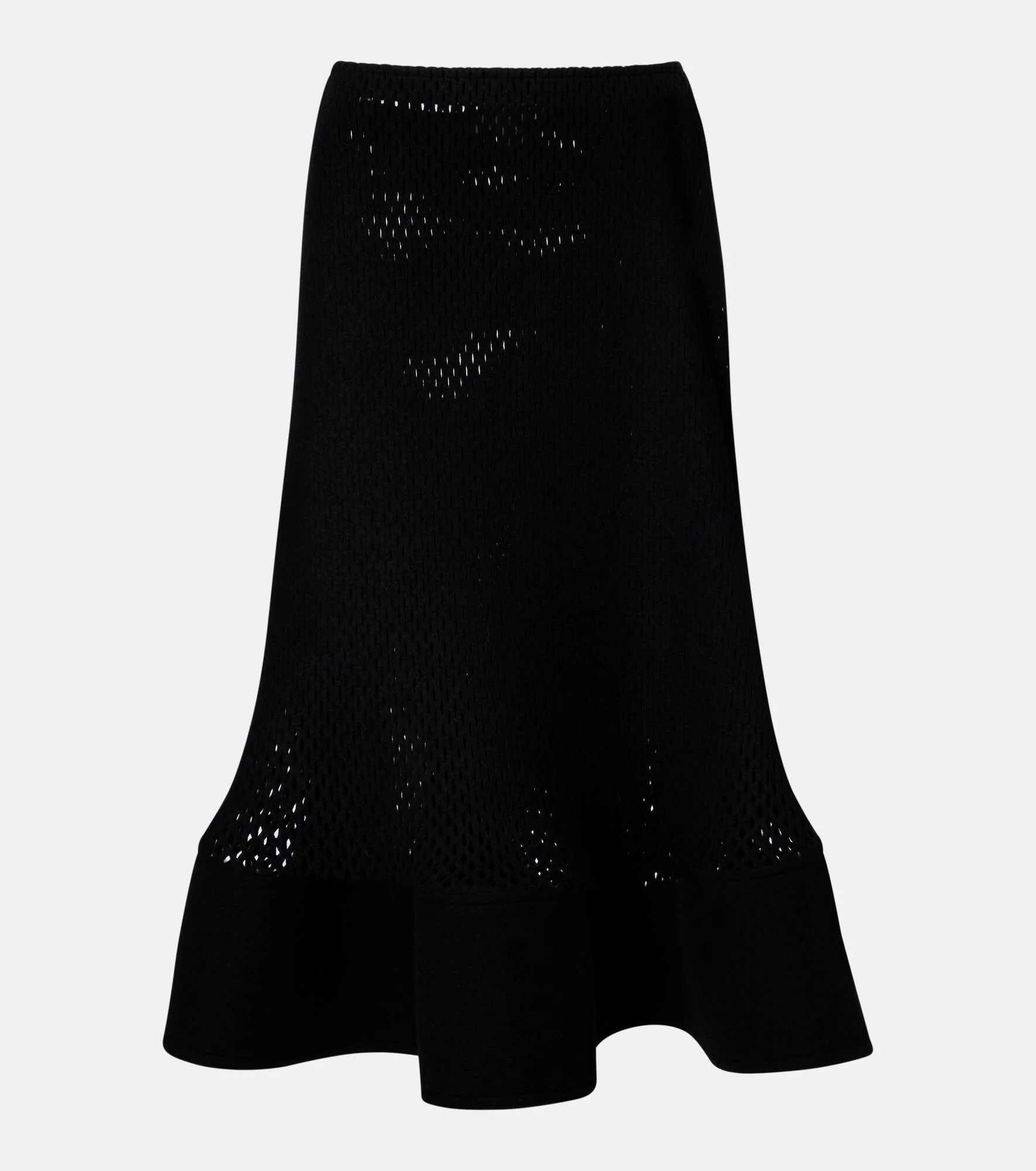 Upholding the legacy of Azzedine Alaia, the maison’s collections achieve an artful balance between sculptural and wearable. Made from a soft wool blend, this midi skirt showcases an open-knit finish and a flared hemline. Product Details - Material: 83% wool, 17% polyamide - Care instructions: dry clean - Made in Italy - Color: black - Designer color name: Noir Alaia - Closure: concealed zipped side - Item number: P01118822 Size & Fit - True to size - Semi-sheer - Stretchy fabric - High-waisted - The model seen in the picture is 178cm-5'10" and wearing a size FR 34