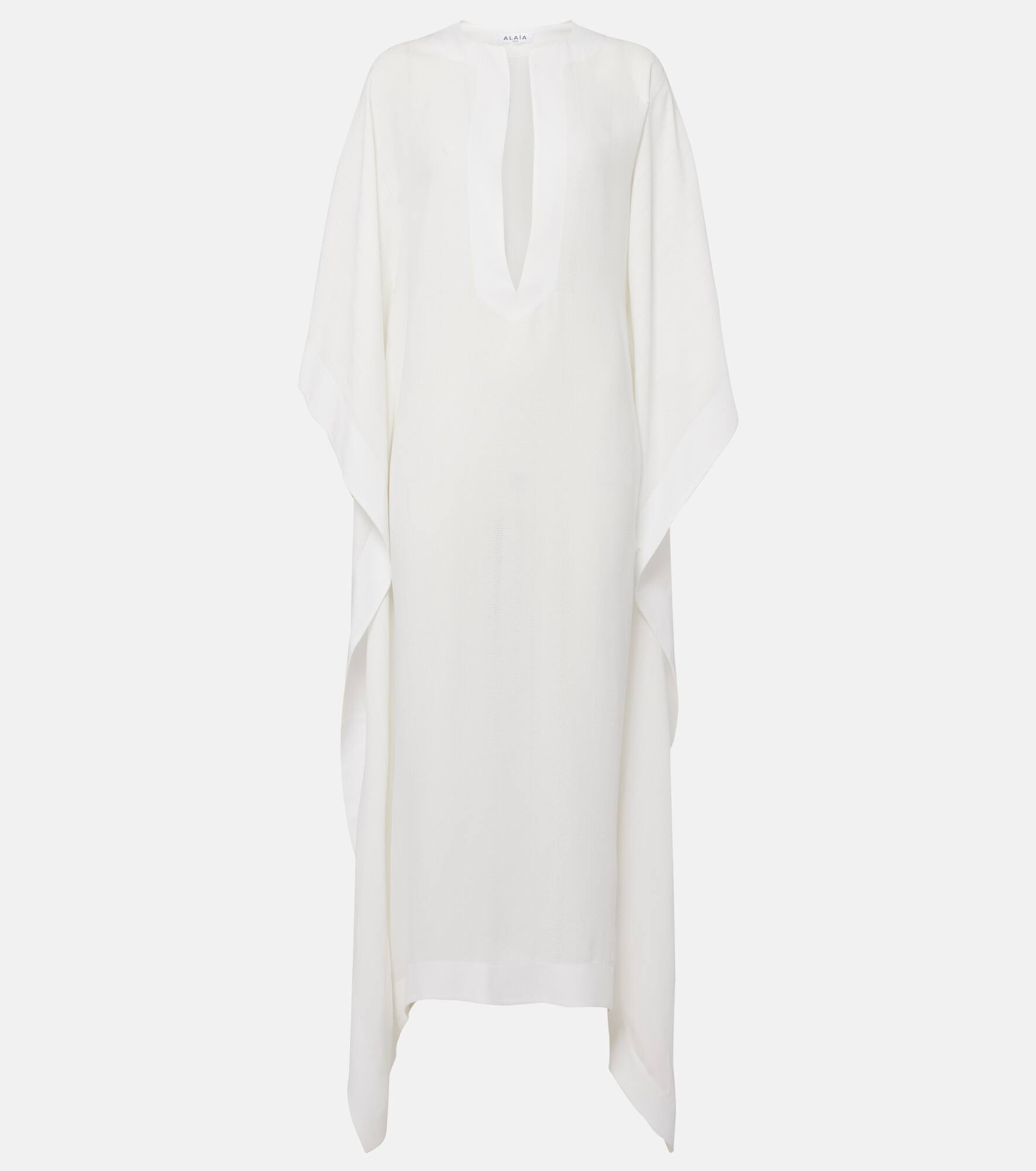 This Alaia oversized kaftan is crafted in Italy from fluid crepe with alluring cut-outs. Designed with a plunging neckline, wide sleeves, and a flowing maxi length, this piece offers a breezy yet refined look. Product Details - Material: 100% viscose - Care instructions: dry clean - Made in Italy - Designer color name: Blanc - Item color: white - Item number: P01047487 Size & Fit - True to size - Oversized - Non-stretchy fabric - The model seen in the picture is 178cm-5'10" and wearing a size FR 36