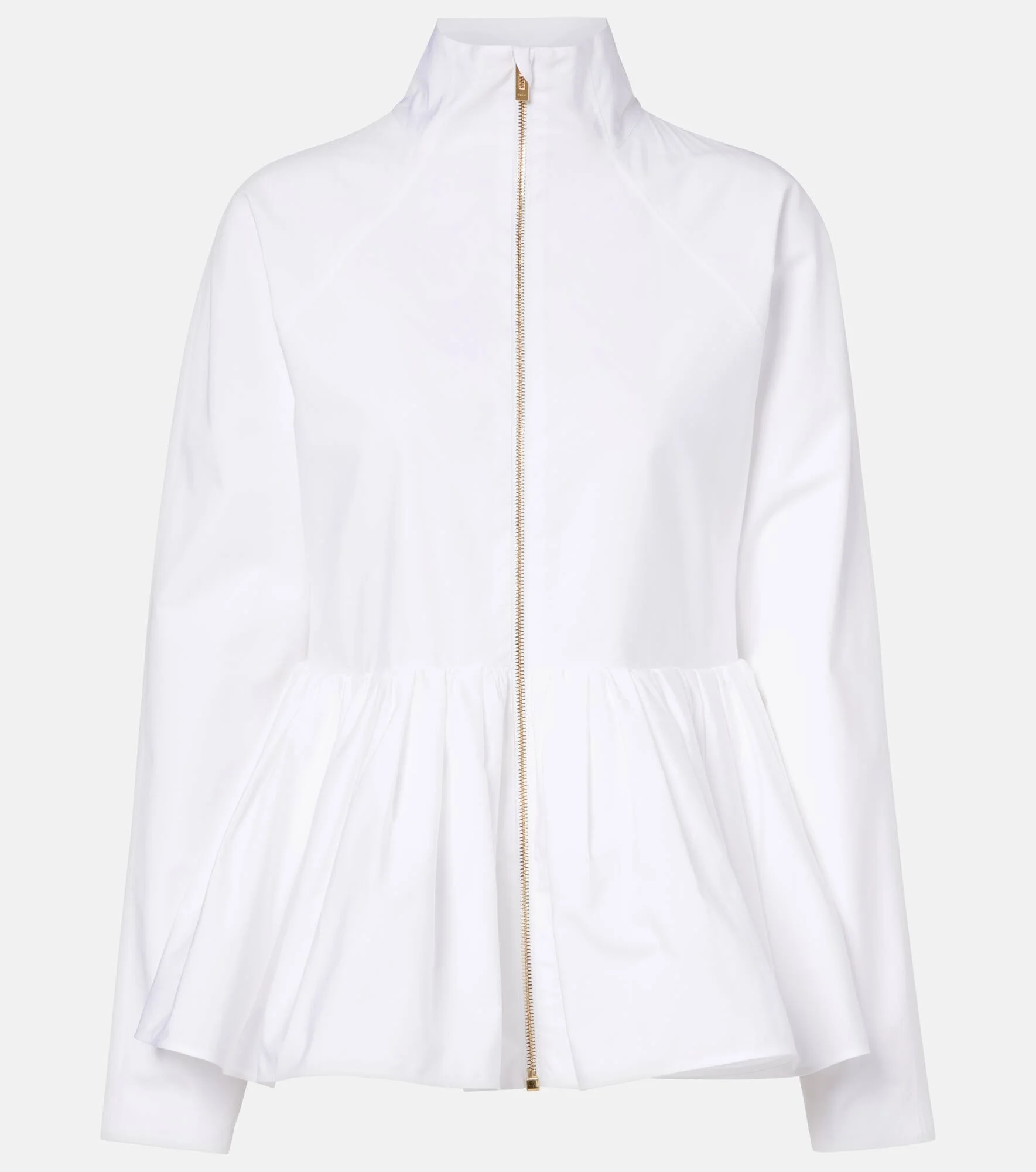 Upholding the legacy of Azzedine Alaia, the maison’s collections achieve an artful balance between sculptural and wearable. This jacket is made in Italy from cotton poplin with side-slit pockets, a zip-up front, and peplum hem. Product Details - Material: 100% cotton - Care instructions: dry clean - Made in Italy - Color: white - Designer color name: Blanc - Closure: zipped front - Pockets: side slit pockets - Item number: P01172493 Size & Fit - Fits large to size - we recommend trying one size smaller - Cinched waist - Straight fit - Non-stretchy fabric - Falls below the hip - Height of model is 180cm-71" and wears a size FR 34