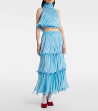 Honoring Azzedine Alaia’s legacy, the maison’s sculptural yet wearable collections hold an artful balance that only the most skilled designers can achieve. This top features a cropped silhouette and a high neckline with pleated detailing accents. Product Details - Material: 55% polyamide, 45% polyester - Care instructions: specialist clean - Made in Italy - Designer color name: Bleu Glacier - Item color: blue - Collar: mockneck - Closure: snap-buttoned fastenings - Item number: P01078727 Size & Fit - True to size - Close fit at the neck - Fitted - Slightly stretchy fabric - Cropped - The model seen in the picture is 178cm-5'10" and wearing a size FR 34