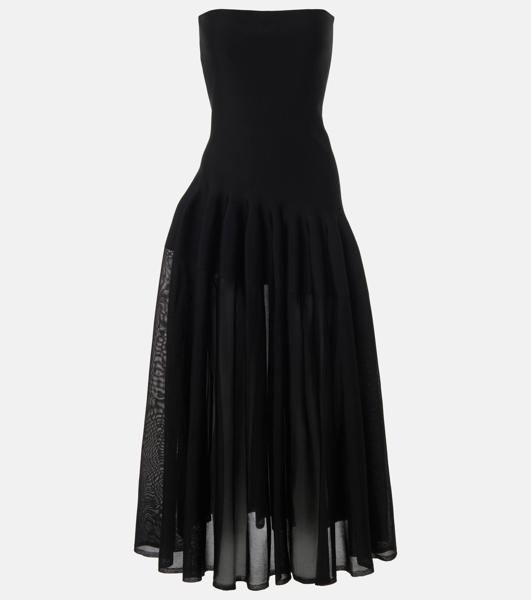 Honoring Azzedine Alaia’s legacy, the maison’s sculptural yet wearable collections hold an artful balance that only the most skilled designers can achieve. Made in Italy, this gown has a strapless neckline with gentle pleating at the skirt. Product Details - Material: 84% viscose, 15% polyamide, 1% polyurethane - Care instructions: dry clean - Made in Italy - Designer color name: Noir Alaia - Item number: P01018674 Size & Fit - True to size - Strapless - Relaxed fit from the hip down - Slightly stretchy fabric - The model seen in the picture is 178cm-5'10" and wearing a size FR 36