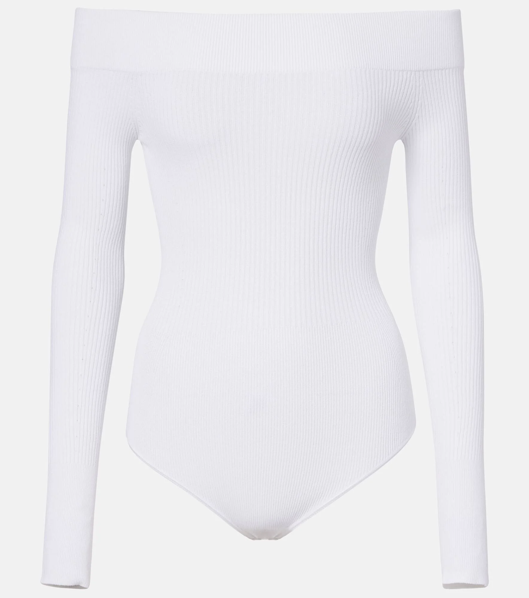 Upholding the legacy of Azzedine Alaia, the maison’s collections achieve an artful balance between sculptural and wearable. This bodysuit is made to an off-shoulder silhouette with a ribbed-knit design. Product Details - Material: 81% viscose, 17% polyester, 2% polyamide - Care instructions: dry clean - Made in Italy - Color: white - Designer color name: Blanc - Closure: snap-buttoned fastenings - Cuff: ribbed - Item number: P01166052 Size & Fit - True to size - Off-the-shoulder - Semi-sheer - Fitted - Stretchy fabric - Medium-cut leg - The model seen in the picture is 178cm-5'10" and wearing a size FR 34
