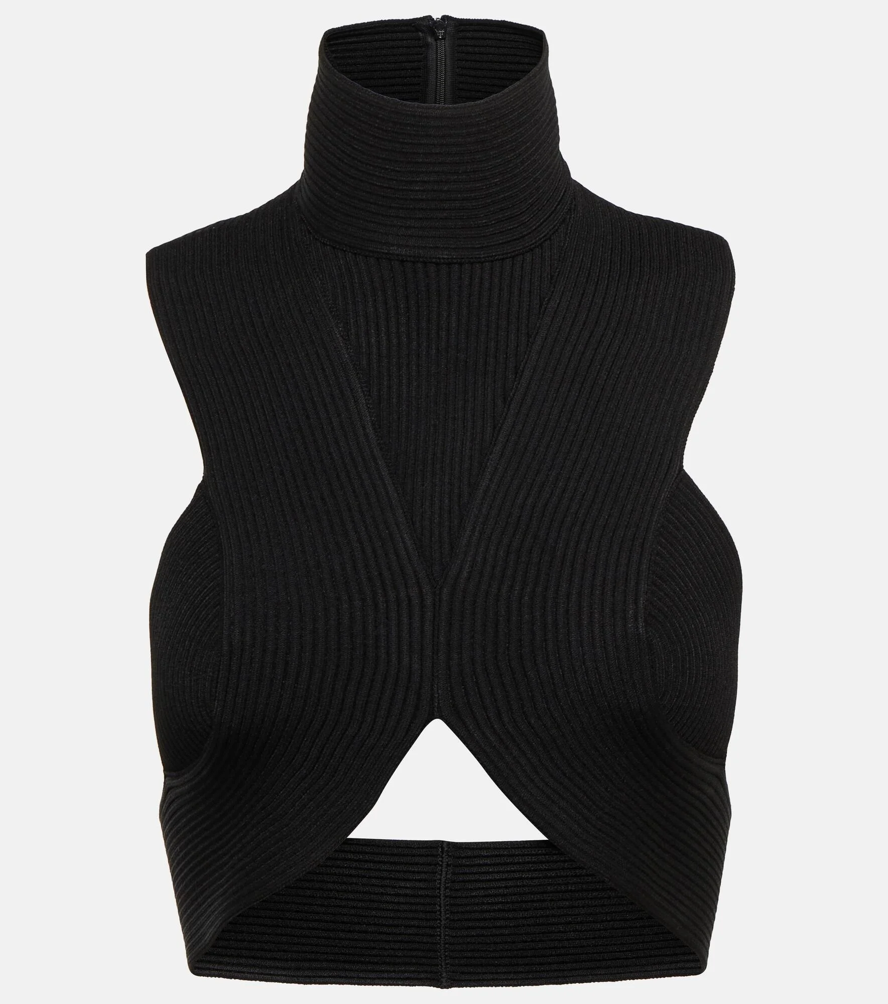 This cropped top from Alaïa is defined by its alluring and sculptural halterneck silhouette. The style is made from a ribbed-knit fabric that contours the bodice and has a zipped closure at the back of the neck. Product Details - Material: 83% viscose, 17% polyester - Care instructions: dry clean - Made in Italy - Designer color name: Noir Alaia - Item number: P00752574 Size & Fit - True to size - Low back - Fitted - Mid-weight material - Cropped - The model seen in the picture is 178cm-5'10" and wearing a size FR 36
