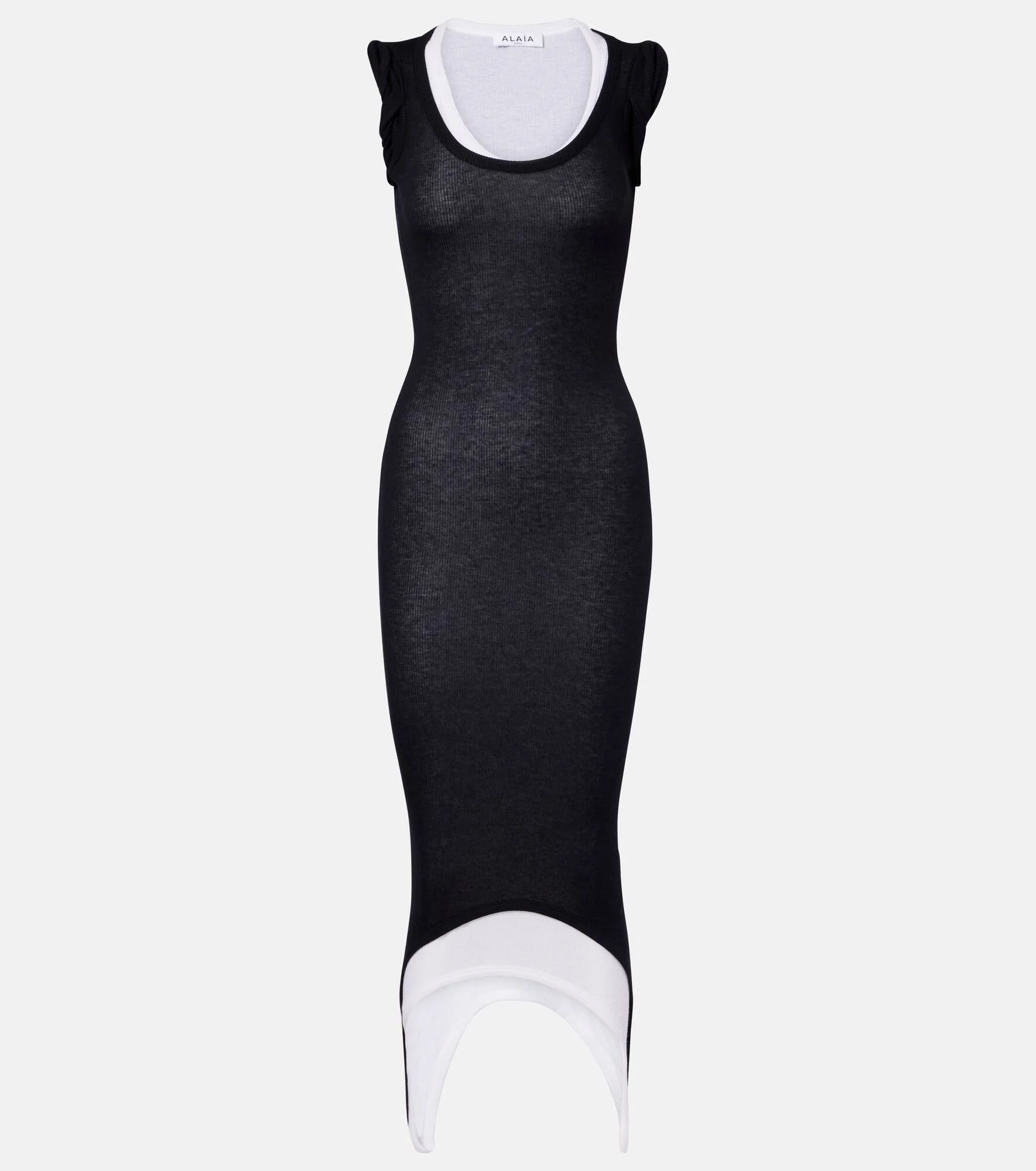 Upholding the legacy of Azzedine Alaia, the maison’s collections achieve an artful balance between sculptural and wearable. This midi dress is made in Italy from a ribbed-knit fabric with creased-detailing at the shoulders. Product Details - Material: 83% modal, 10% cashmere, 7% elastane - Care instructions: dry clean - Made in Italy - Color: black - Designer color name: Noir/Blanc - Separate lining slip: 83% modal, 10% cashmere, 7% elastane - Two-piece set - Hem: uneven - Cuff: turnback - Item number: P01166136 Size & Fit - True to size - Fitted - Stretchy fabric - Height of model is 180cm-71" and wears a size FR 34