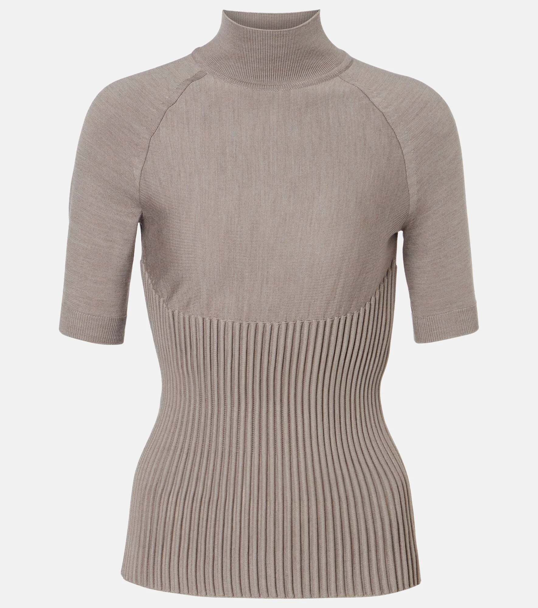 Upholding the legacy of Azzedine Alaia, the maison’s collections achieve an artful balance between sculptural and wearable. This top is made from a soft wool blend and features a turtleneck and a ribbed-knit panel. Product Details - Material: 92% wool, 6% polyamide, 2% elastane - Care instructions: dry clean - Made in Italy - Color: beige - Designer color name: Beige - Item color: beige - Material II: 96% wool, 3% polyamide, 1% elastane - Collar: turtleneck - Cuff: ribbed - Item number: P01112298 Size & Fit - True to size - Fitted - Slightly stretchy fabric - Falls to the hip - Please note: small cups - If you wear a C cup or bigger, we recommend trying one size larger - The model seen in the picture is 178cm-5'10" and wearing a size FR 36