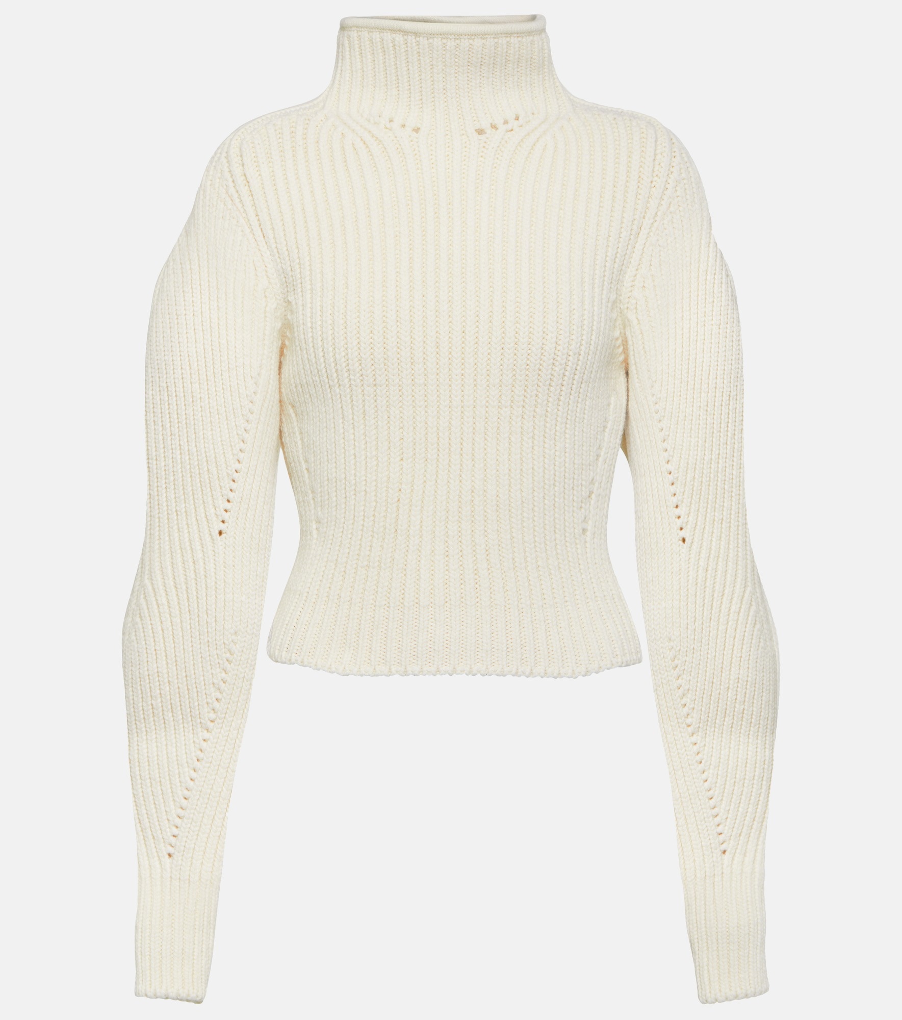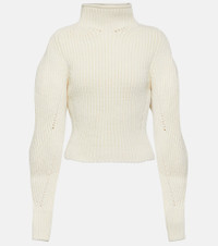 Turn to Alaïa for statement knitwear such as this sweater. Rib-knitted from a warm wool blend with touches of cashmere, it features a high neck and curved, voluminous sleeves. Product Details - Material: 90% wool, 8% cashmere, 2% polyamide - Closure: invisible zipper, zipper fastening - Care instructions: dry clean - Made in Italy - Designer color name: Blanc Casse - Material II: 84% wool, 7% polyamide, 7% cashmere, 2% elastane - Item number: P00846546 Size & Fit - True to size - Cinched waist - Heavy material - Thick material - Slightly cropped - The model seen in the picture is 178cm-5'10" and wearing a size FR 36