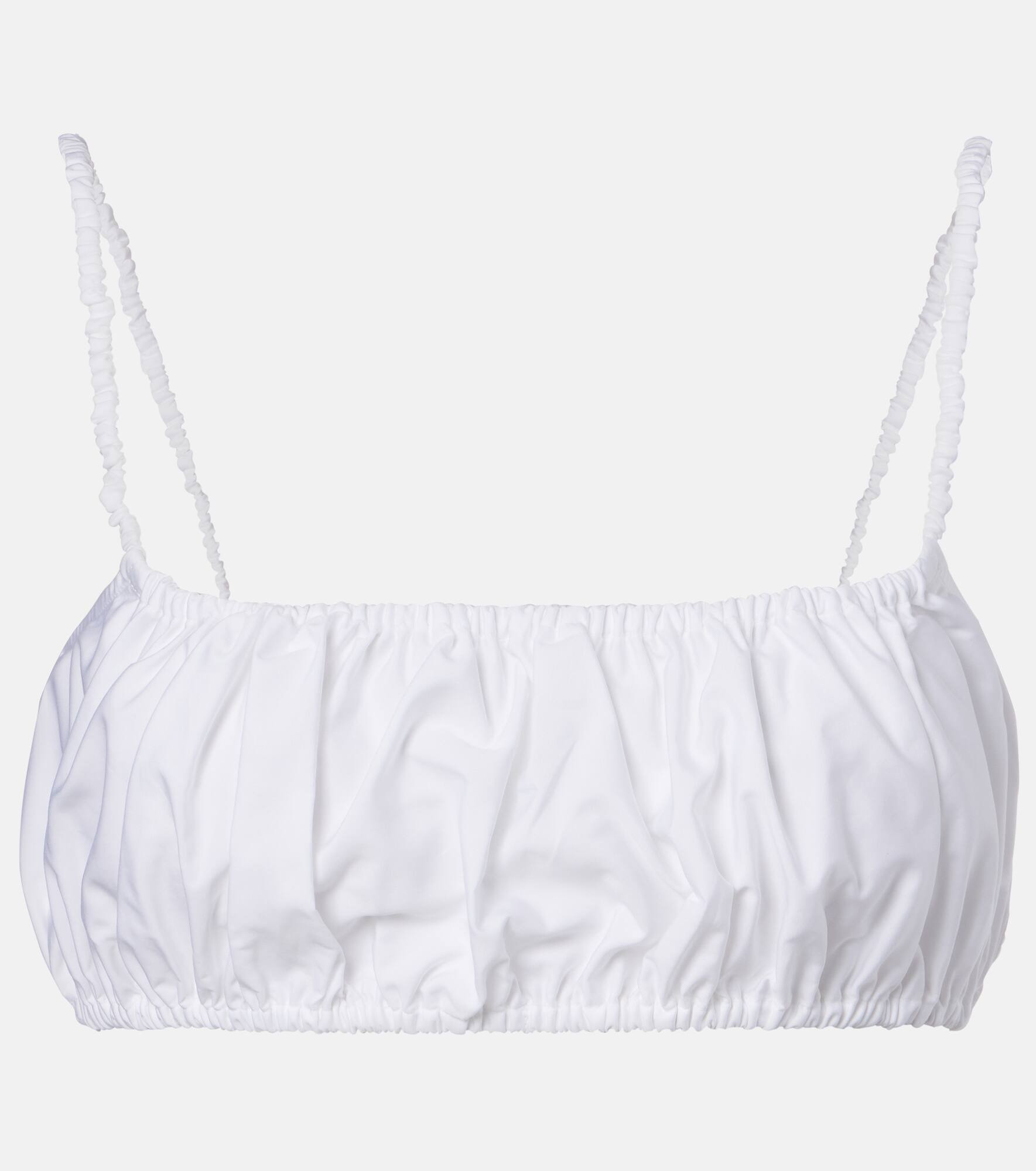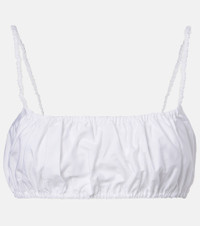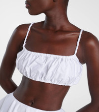 Crafted in Italy from soft cotton, this bra top from Alaia is a chic choice for layering or warm-weather styling. The minimalist silhouette features a square neckline, slim ruched straps, and an elasticated, shirred hemline. Product Details - Material: 100% cotton - Care instructions: specialist clean - Made in Italy - Designer color name: Blanc - Item color: white - Hem: elasticated - Item number: P01047387 Size & Fit - Fits large to size - we recommend trying one size smaller - Fitted - Elasticated hem - Non-stretchy fabric - Cropped - The model seen in the picture is 178cm-5'10" and wearing a size FR 34