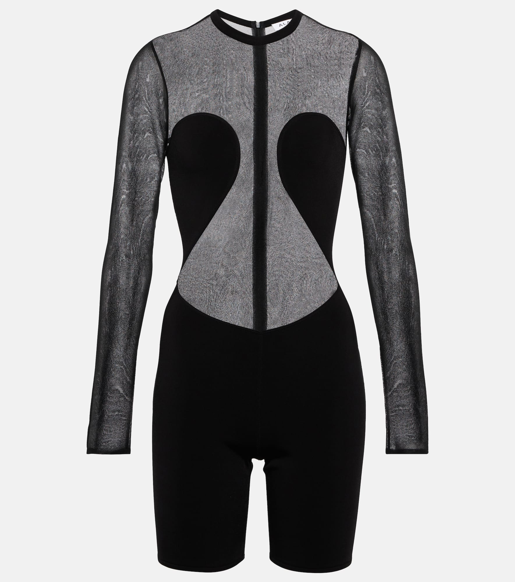 Tune into the trend for semi-sheer styles with this jumpsuit from Alaïa. It's cut to an artful design with skin-revealing mesh panels that are framed by opaque jersey inserts for modesty. Product Details - Material: 18% silk, 65% viscose, 1% polyurethane, 16% polyamide - Made in Italy - Closure: zipped back - Designer color name: Noir Alaia - Care instructions: dry clean - Item number: P00634292 Size & Fit - True to size - Semi-sheer - Fitted - Mid-weight material - Inseam length approx: 16cm-6.5" - The model seen in the picture is 178cm-5'10" and wearing a size FR 36