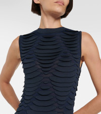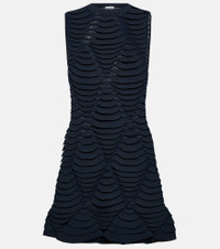 This sleeveless minidress from Alaïa is made from compact knit fabric for a textured, snake-inspired effect. Godets at the hem add an element of movement to the figure-hugging silhouette. Product Details - Material: 78% viscose, 6% polyester, 1% elastane, 1% polyurethane, 14% polyamide - Care instructions: dry clean - Made in Italy - Designer color name: Minuit - Color: navy - Item number: P00846490 Size & Fit - Fits small to size - we recommend trying one size larger - Cinched waist - Mid-weight material - The model seen in the picture is 178cm-5'10" and wearing a size FR 38