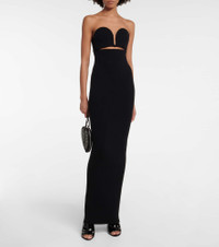 This gown from Alaia is a worthy addition to your evening-wear edit. Made from a wool-blend in an English rib-knit, it features a minimalist column silhouette with underwired cup spirals that frame the bust. Product Details - Material: 9% polyamide, 17% viscose, 63% wool, 4% polyester, 2% elastane, 5% cashmere - Care instructions: dry clean - Made in Italy - Designer color name: Noir Alaia - Underwired cups - Item number: P00700898 Size & Fit - True to size - Strapless - Internal boned corset for support - Padded top - The model seen in the picture is 178cm-5'10" and wearing a size FR 36