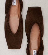 Every step is graceful with these ballet flats from Alaia. The pair is crafted from suede with subtly elasticated uppers, lined with leather, and complete with flat, square toes. Product Details - Upper: leather (suede), leather - Lining: leather - Sole: leather insole and sole - Toe shape: square toe - Made in Italy - Includes: dust bag, shoe box - Designer color name: Brun Fonce - Item color: brown - Item number: P01045905 Size & Fit - True to size - Slightly narrow at the seam - European sizes - 1,5cm-0.5" heel (size EU 38)