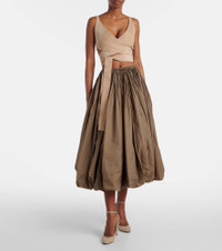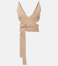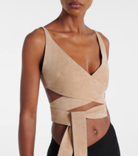 Honoring Azzedine Alaia’s legacy, the maison’s sculptural yet wearable collections hold an artful balance that only the most skilled designers can achieve. Italian-made from velvety smooth suede, this crop top is shaped with a V-neckline and wrap-around ties. Product Details - Material: 100% goat leather (suede) - Care instructions: specialist clean - Made in France - Designer color name: Beige Clair - Item color: beige - Contains non-textile parts of animal origin - Closure: tie waist - Item number: P01047475 Size & Fit - True to size - Cinched waist - Adjustable at the waist - Non-stretchy fabric - Cropped - Height of model is 180cm-71" and wears a size FR 36