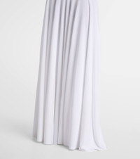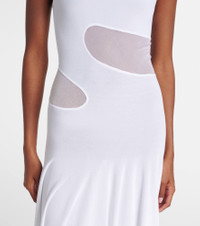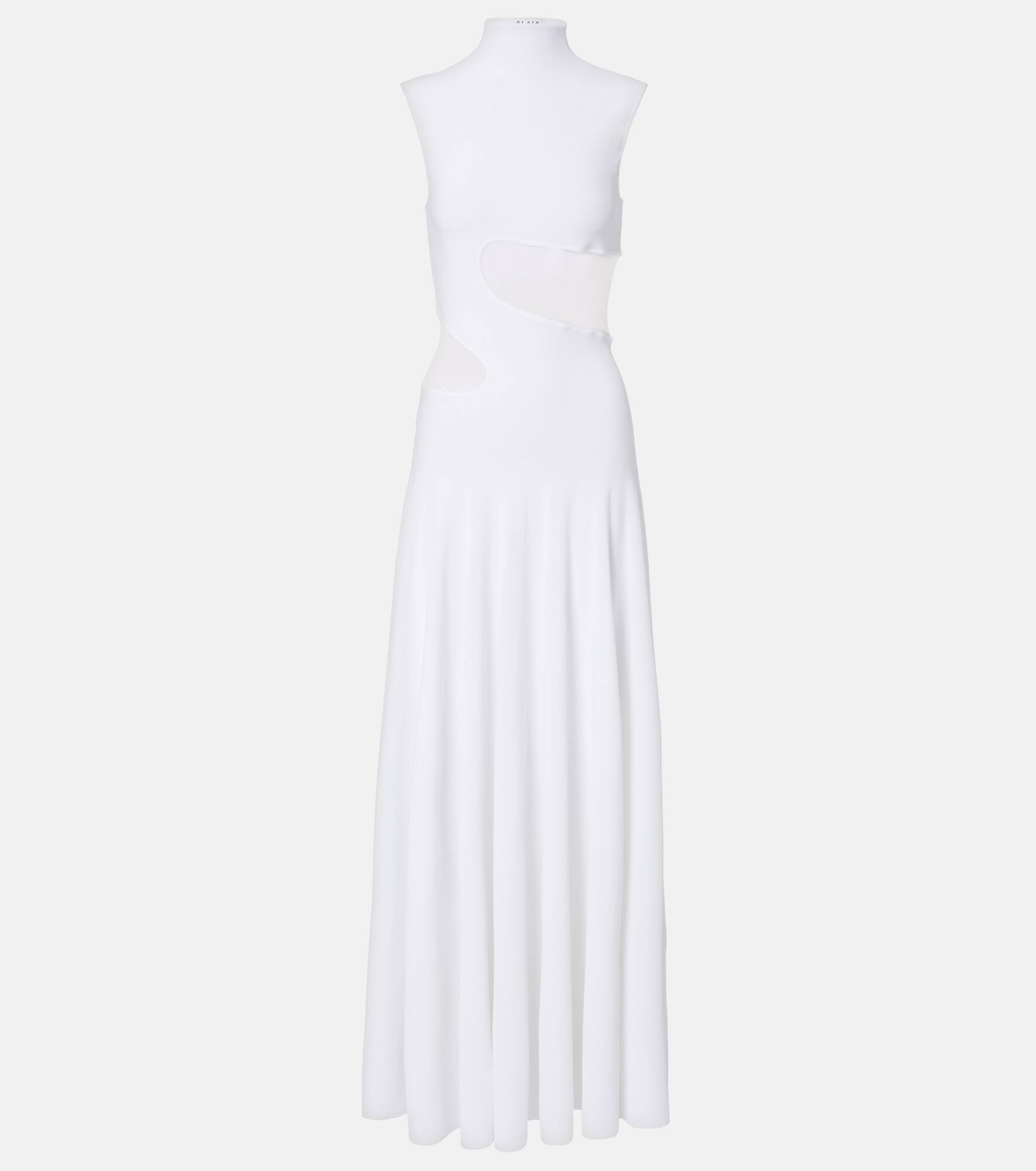 This Alaia maxi dress is tailored to a flared silhouette and adorned with a turtleneck, balancing style and warmth. The sleeveless bodice is detailed with sheer silk panels, adding a refined textural contrast. Product Details - Material: 94% viscose, 6% polyester - Care instructions: dry clean - Made in Italy - Designer color name: Blanc - Item color: white - Material II: 100% silk - Trim: 86% viscose, 8% polyamide, 5% polyester, 1% elastane - Collar: turtleneck - Closure: zipped shoulder - Item number: P01085047 Size & Fit - True to size - Semi-sheer - Fitted - Stretchy fabric - The model seen in the picture is 178cm-5'10" and wearing a size FR 36